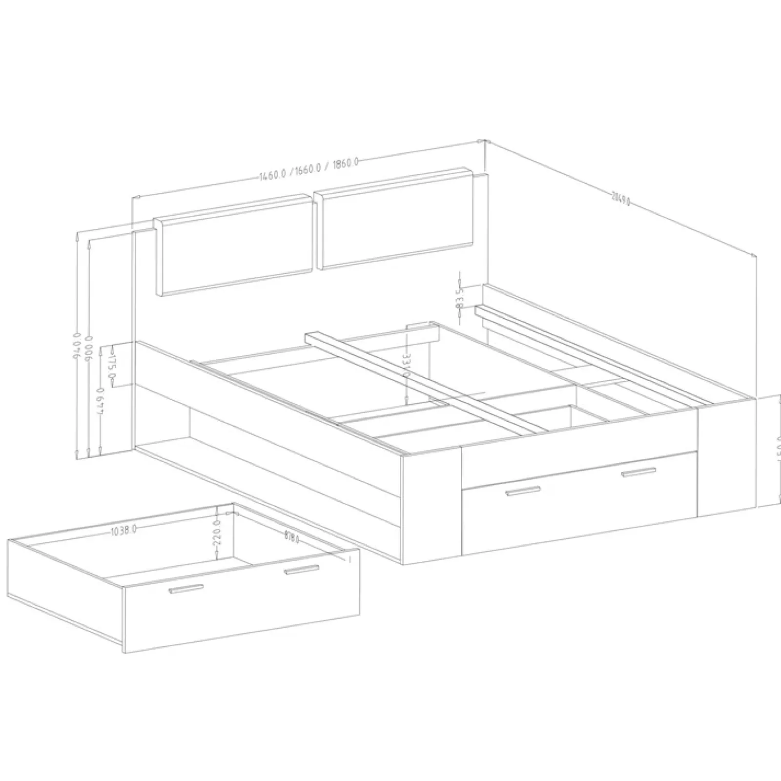 Letto 160×200 Cortina Gihome® rovere scuro e nero lucido con cassettone: grazie alle sue modeste dimensioni questo letto è in grado di garantire il massimo confort.