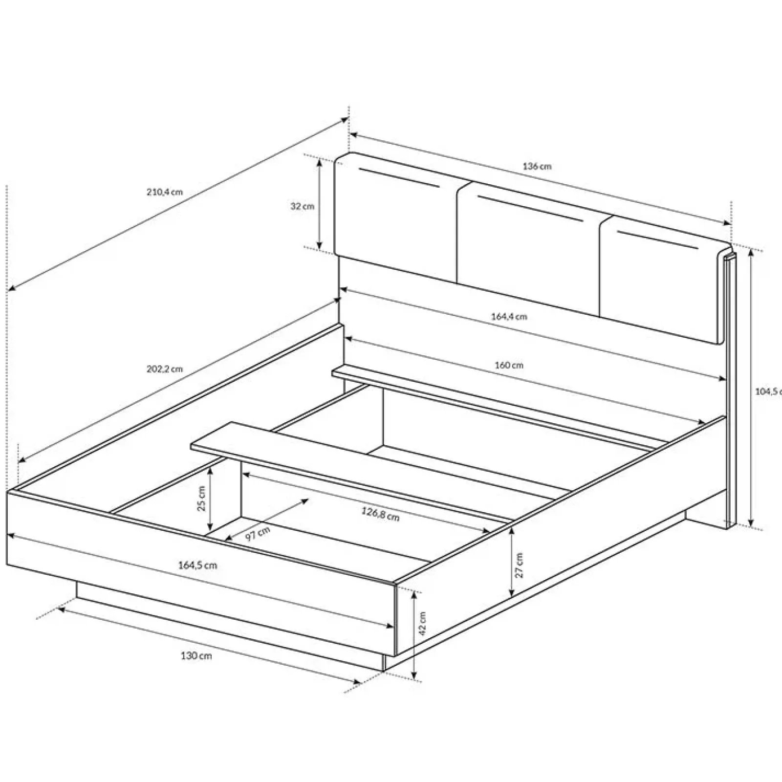 - dimensioni letto: L.164,4 x P.210,4 x H.104,5 cm