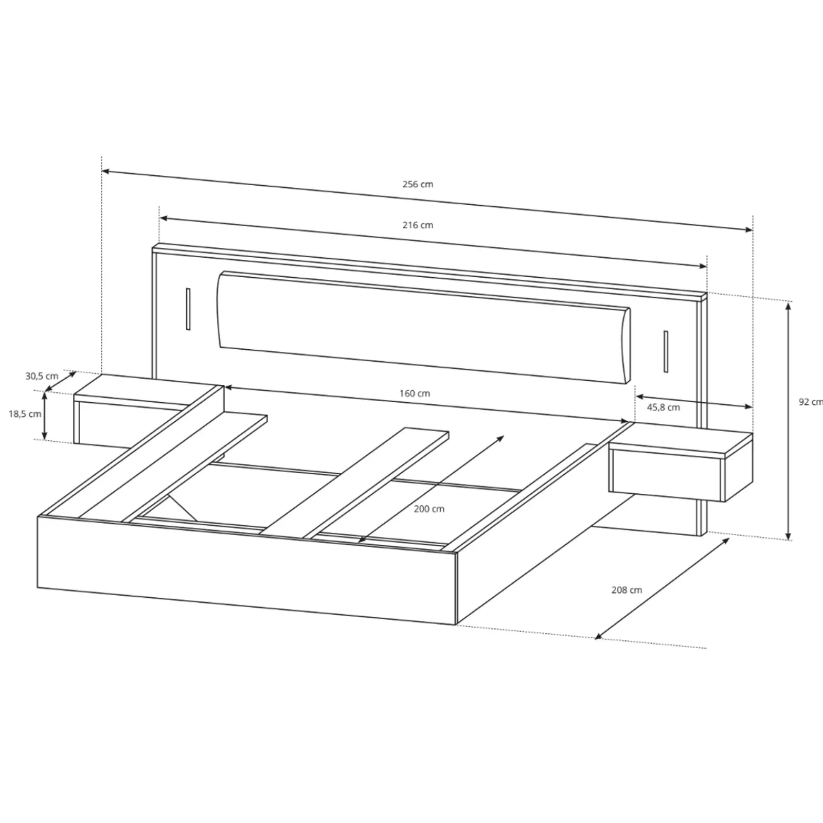 - dimensioni letto e comodini: L.256 x P.208 x H.92 cm