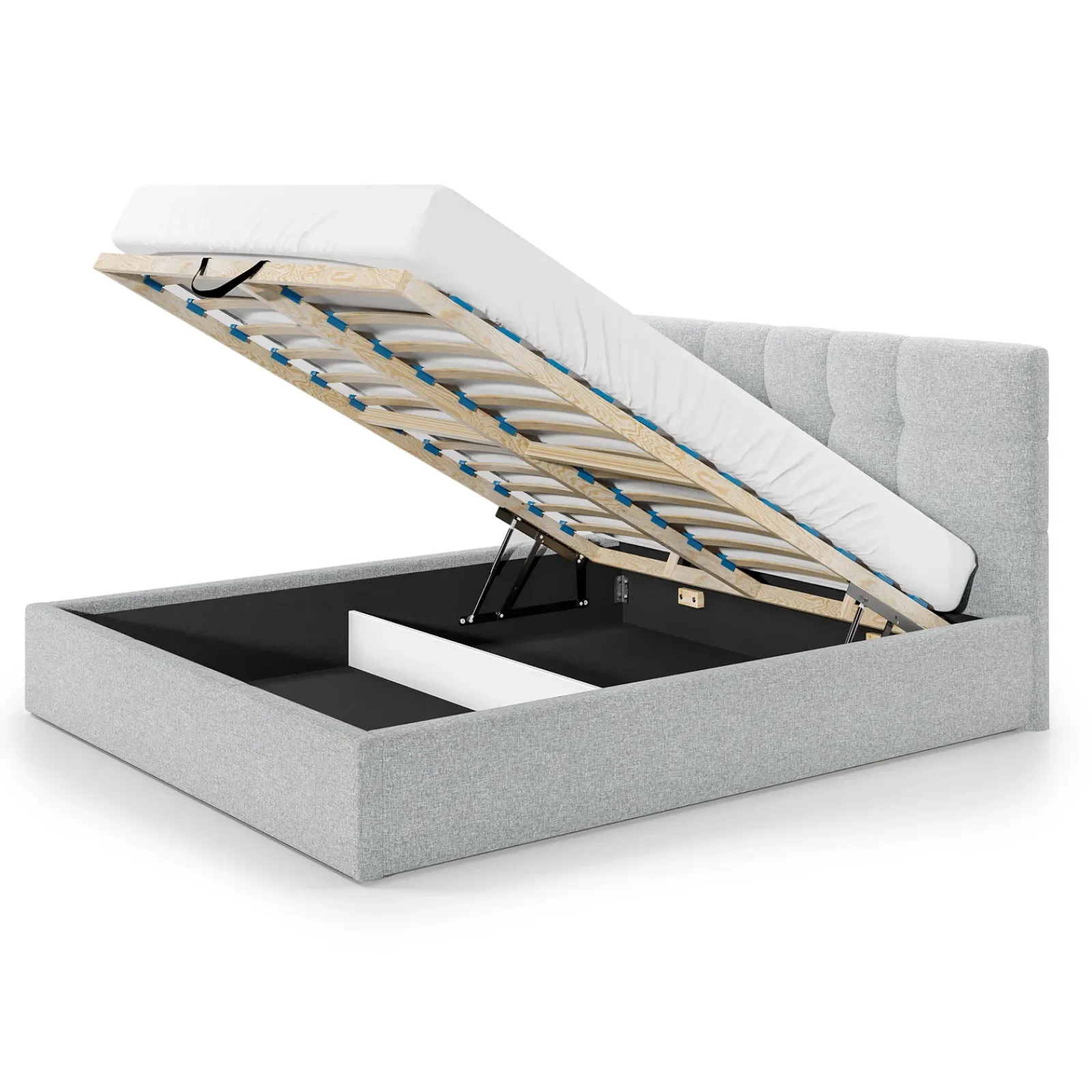 Questo modello è dotato di un capiente contenitore, dotato di molla a gas che facilita l’apertura del letto. Questo vano si trova appena sotto il materasso e ti permette di riporre lenzuola o altri accessori.