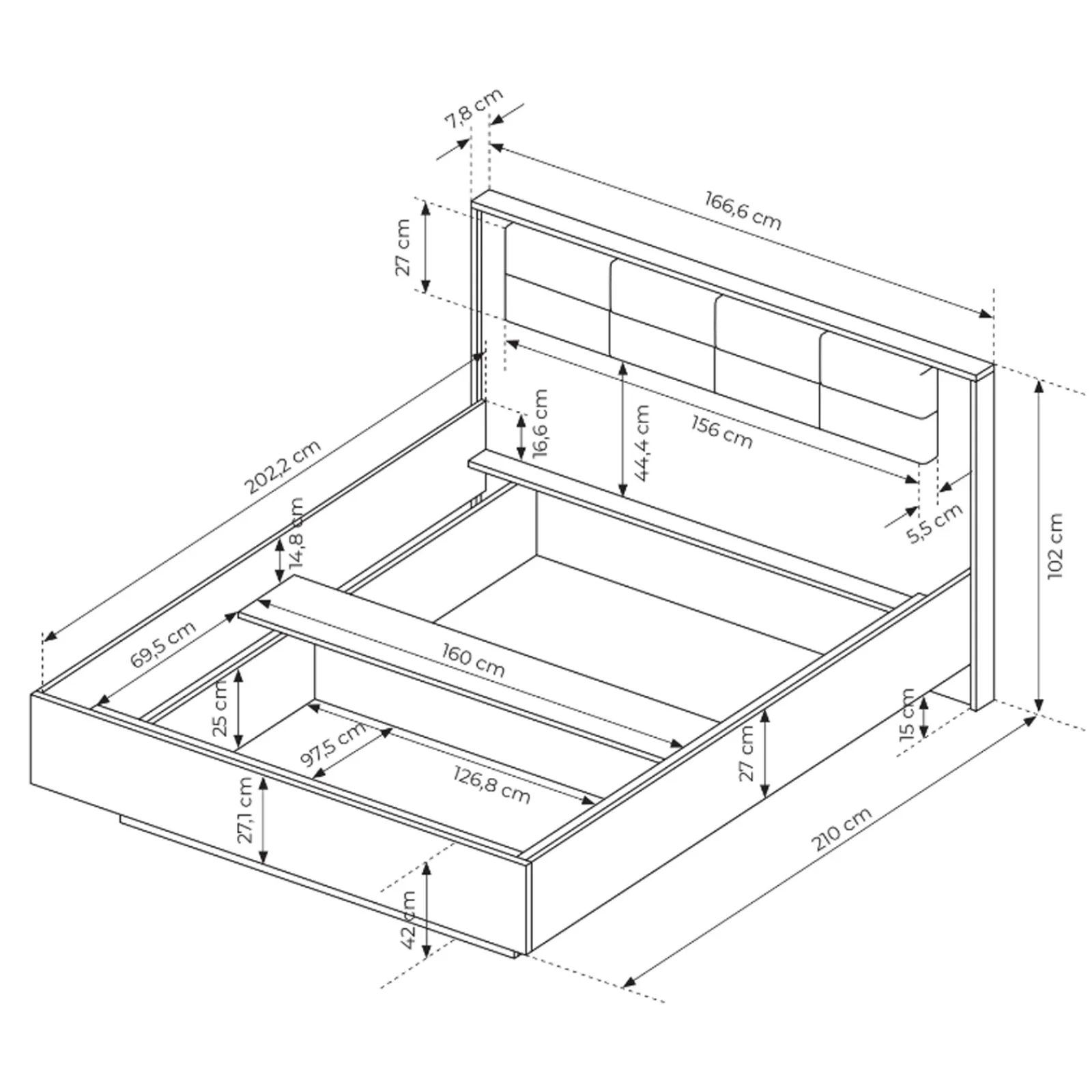 - dimensioni letto contenitore: L.166,6 x P.210 x H.102 cm
