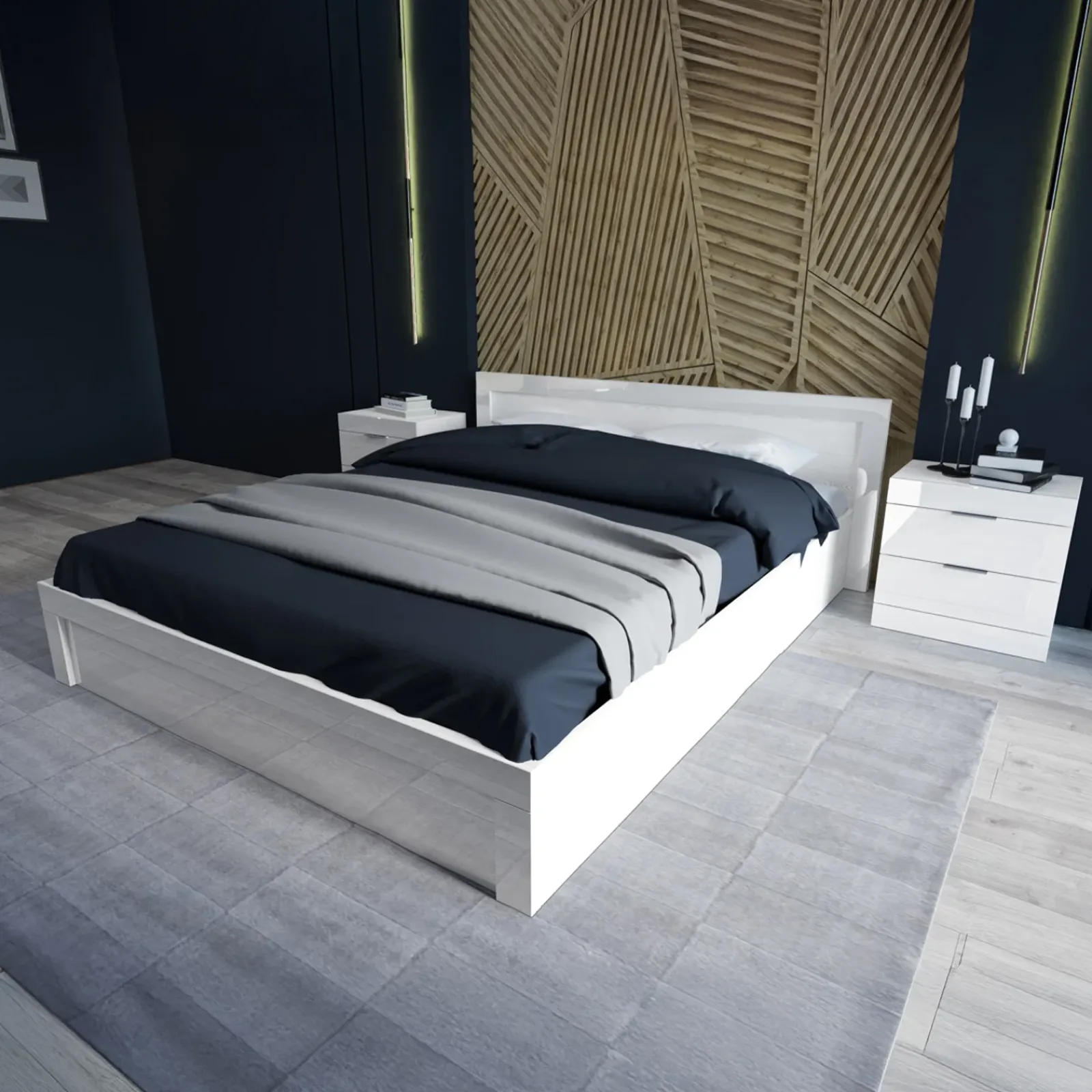 Letto matrimoniale con comodini 160x200cm bianco lucido Alina, moderno ed esteticamente accattivante, è il letto perfetto per illuminare l’ambiente ed imprezziosirlo.
