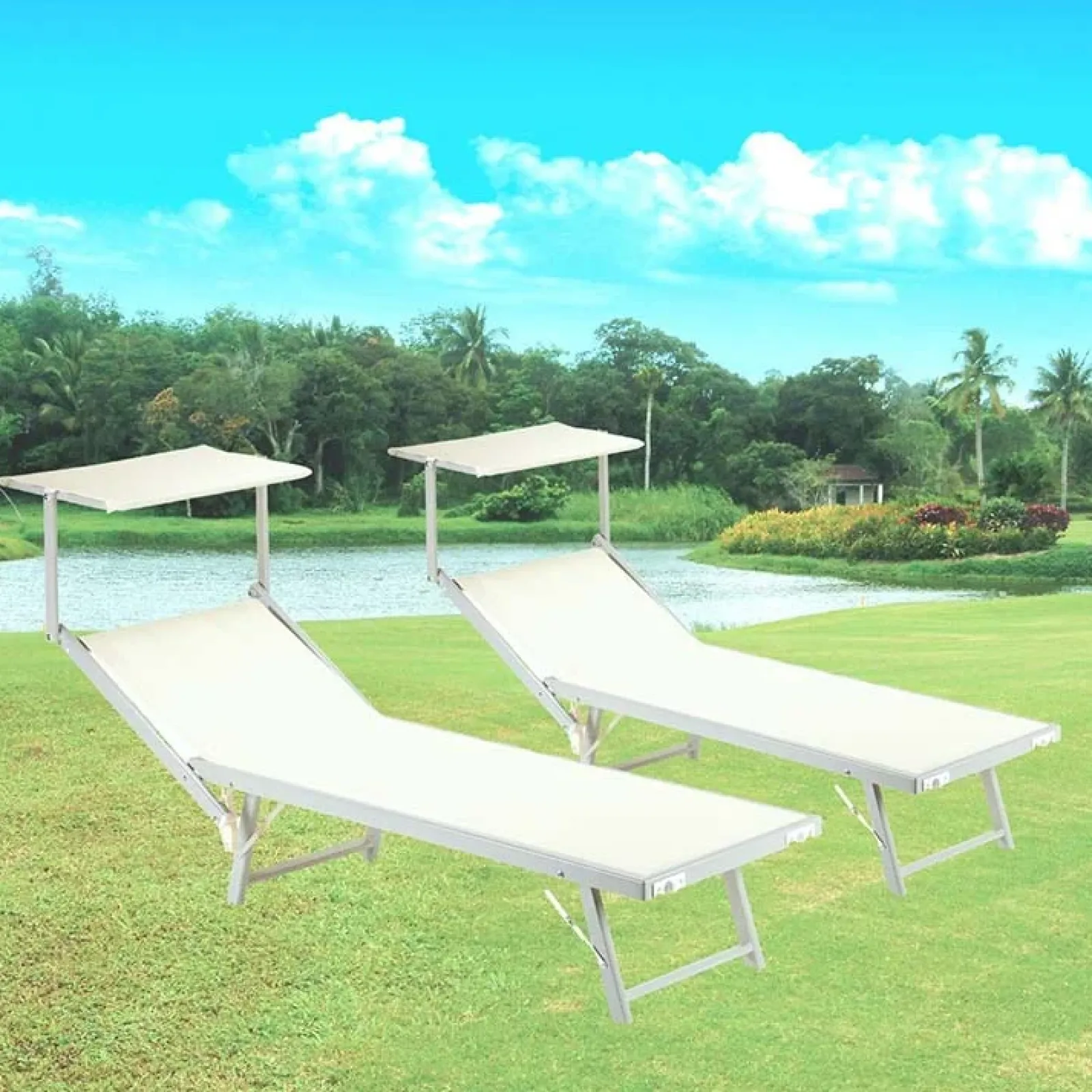 La struttura è in alluminio con copertura in textilene beige.