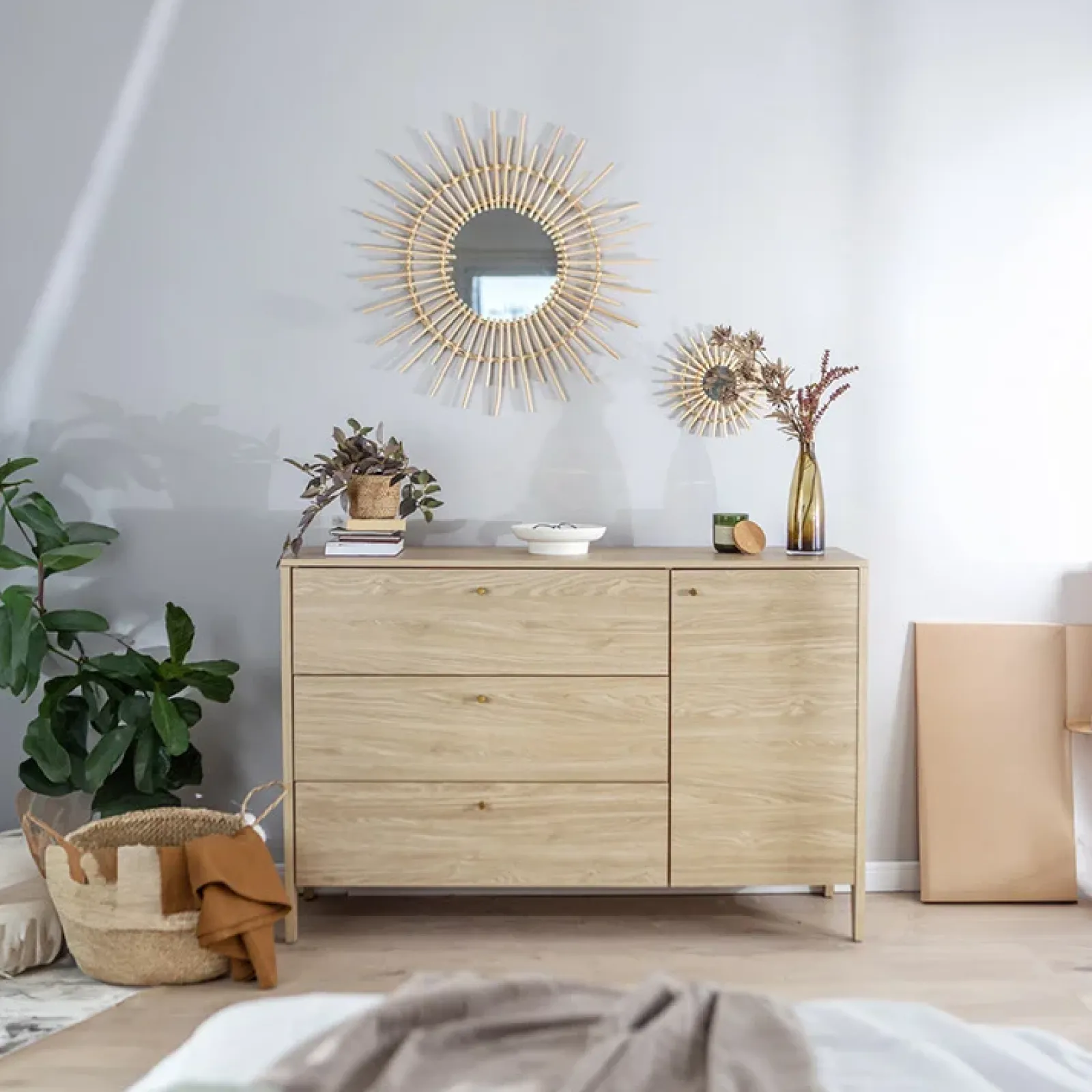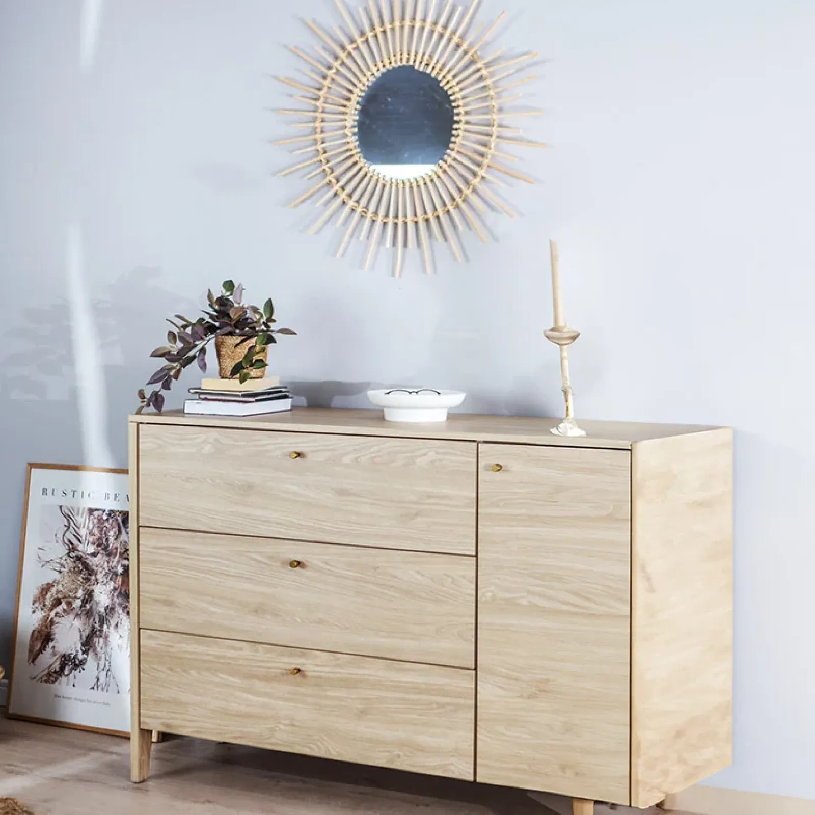 Il design della madia 3 cassetti 1 anta in rovere Luna è versatile e si adatta perfettamente a diversi stili di arredamento, dal contemporaneo al classico. Grazie al suo aspetto sobrio ed elegante, è in grado di aggiungere carattere e personalità a qualsiasi ambiente, rendendola una scelta perfetta per chi cerca un equilibrio tra funzionalità e stile.
