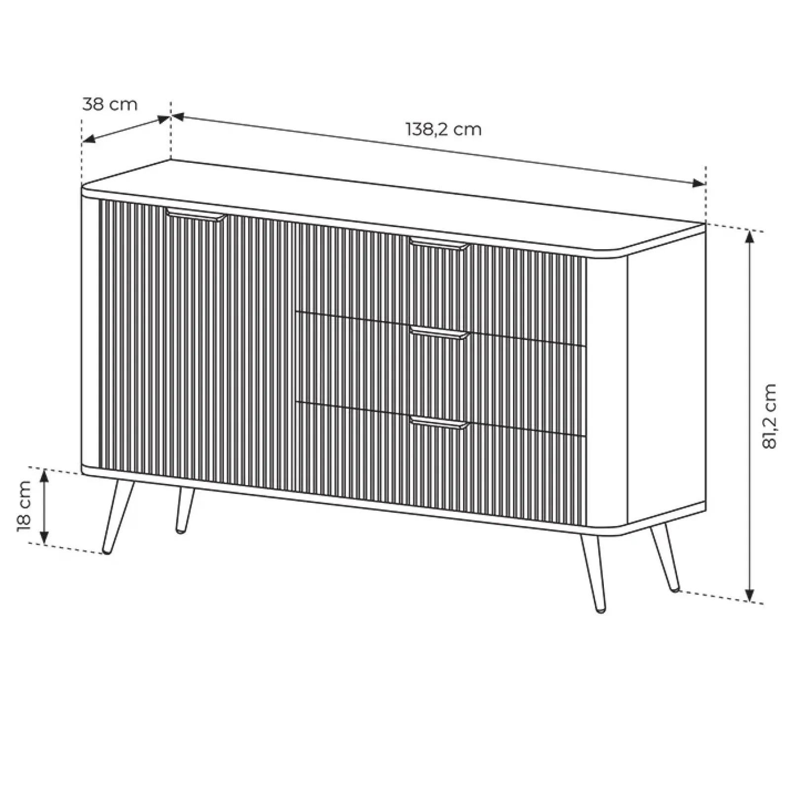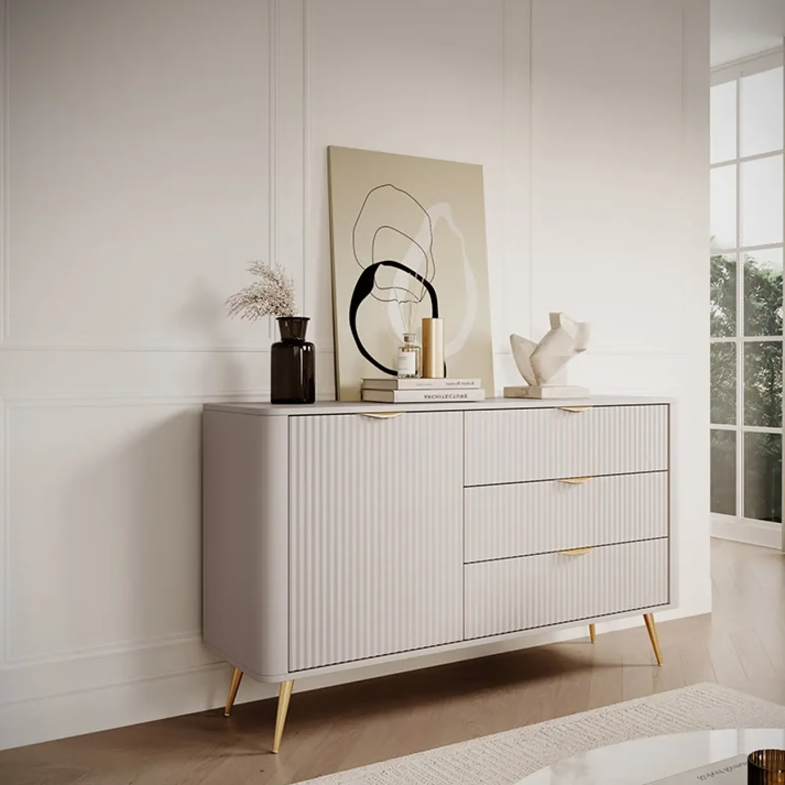 Per il tuo soggiorno vorresti un mobile elegante, capiente e versatile? Quello che stai cercando è la madia 1 anta 3 cassetti Ramis! La sua finitura beige e i frontali cannettati insieme all’asimmetria tra cassetti e ante conferiscono alla madia un design elegante e moderno che si adatta a qualsiasi ambiente della casa. L’anta battente nasconde 2 vani interni, utili per conservare gli oggetti più voluminosi o meno estetici al riparo dalla vista, mantenedo l’ambiente raffinato e ordinato. Il ripiano interno divide lo spazio in modo intelligente, massimizzando la capacità di archiviazione, rendendolo ideale per oggetti di diverse dimensioni, senza creare confuzione. È dotata ulteriormente di 3 cassetti, che offrono una soluzione pratica per riporre i piccoli oggetti come documenti, accessori, utensili o biancheria, per avere tutto a portata di mano ma sempre in ordine. L’ampia superficie del mobile è ideale per esporre i tuoi souvenir da viaggi, rendendo il soggiorno un luogo personale e accogliente. La struttura poggia su comodi piedini in metallo dorato alti 18 cm facilitando così anche la pulizia del pavimento. La madia offre così un mix perfetto di praticità e design! Il prodotto è disponibile anche in altre finiture!