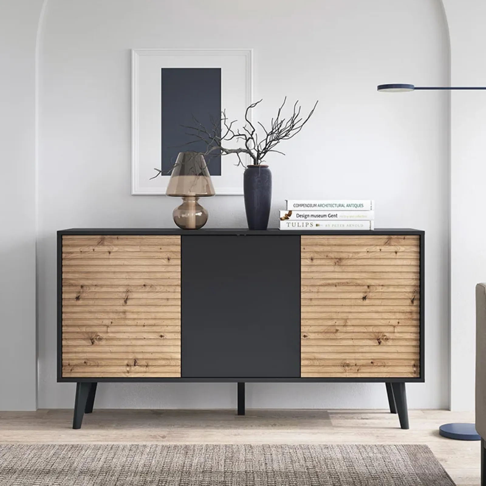 La sua forza risiede nella capacità di donare quell’atmosfera calda al soggiorno o sala da pranzo e, allo stesso tempo, essere magari estremamente contemporanea e funzionale. É dotata di 3 ante battenti bicolore rovere naturale e nero che nasconde al suo interno 6 comodi vani.