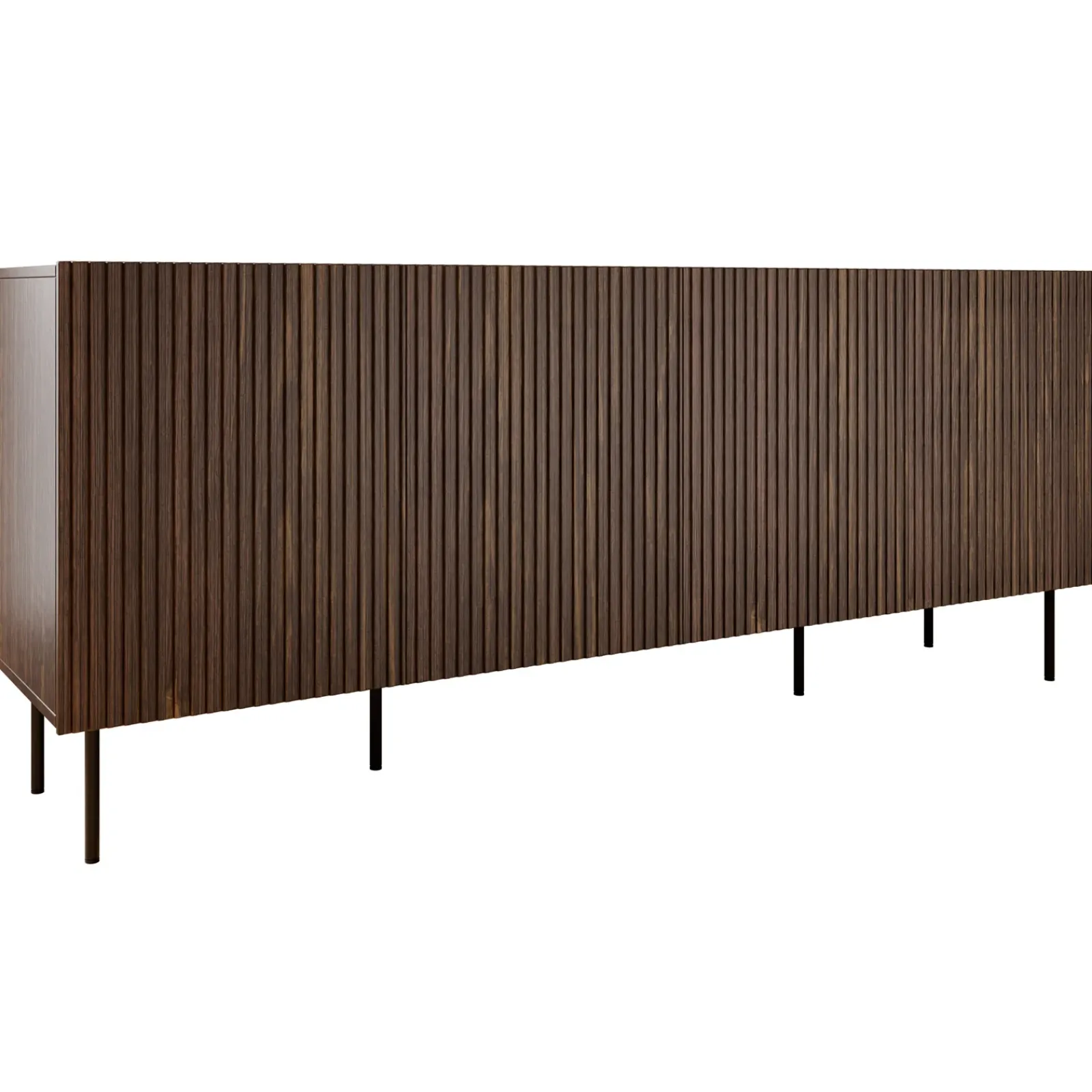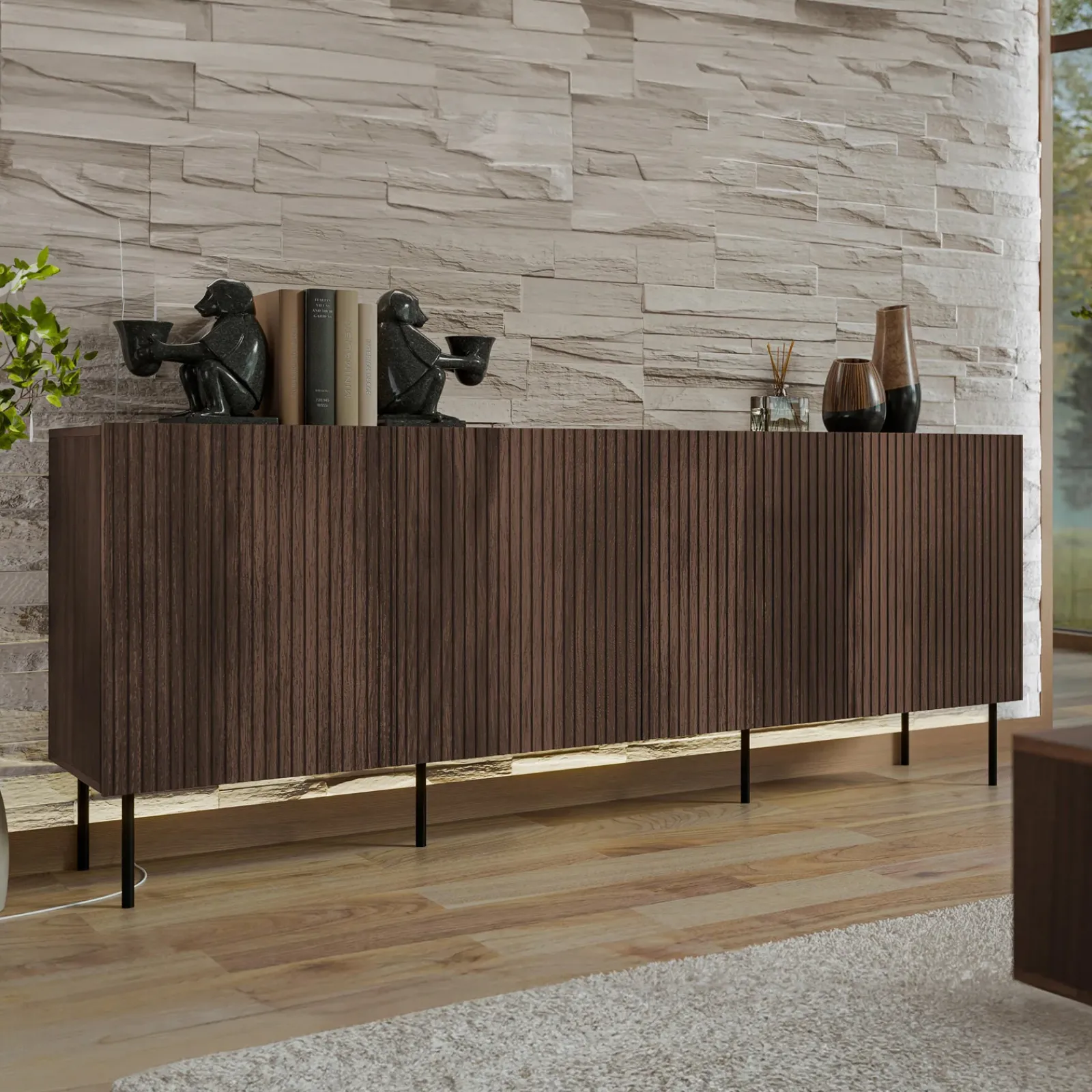 Sei pronto a rivoluzionare il tuo soggiorno, trasformandolo in un angolo di eleganza e comfort senza pari? Grazie alla Madia 4 ante Gabiot, questo è possibile! La sua calda finitura in noce, abbinata ai frontali cannettati, fa di questo mobile un vero capolavoro, perfetto per arricchire qualsiasi spazio con eleganza e stile. Dotata di 4 ante battenti senza maniglie, con i frontali che sporgono leggermente per facilitare l’apertura, la madia rivela un interno ben organizzato: otto vani, suddivisi da quattro ripiani, offrono ampio spazio per riporre libri, giochi da tavolo, console di gioco e accessori vari. Dì addio al disordine e accogli un soggiorno impeccabile, dove ogni oggetto trova il suo posto! La superficie superiore del mobile è ideale per esporre fotografie incorniciate, vasi in ceramica colorata, libri d’arte, o una piccola lampada da tavolo per creare un’atmosfera accogliente e personale. Puoi anche aggiungere una piantina, per portare un tocco di verde nel tuo soggiorno. Il mobile poggia su piedini in metallo nero, che non solo conferiscono un aspetto contemporaneo e sofisticato, ma garantiscono anche stabilità e robustezza, completando perfettamente il look elegante della madia. Non perdere l’occasione di trasformare il tuo soggiorno in uno spazio unico e raffinato: la Madia 4 ante Gabiot è il complemento ideale per unire bellezza e funzionalità!