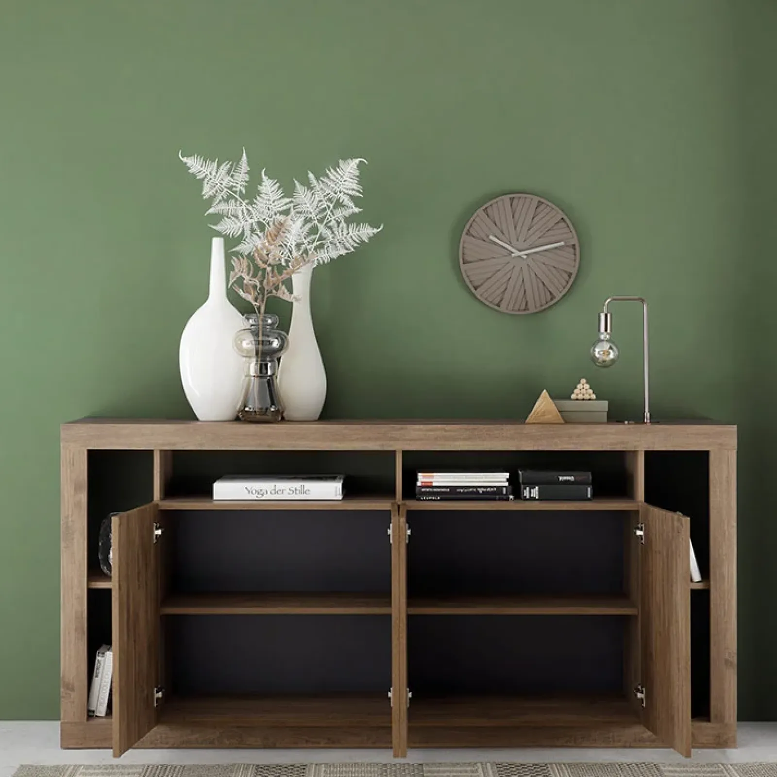 La madia moderna soggiorno 4 ante 210x102cm Trilogy nella finitura rovere scurorappresenta uno spazio funzionale ed organizzato, efficace e decorativo.