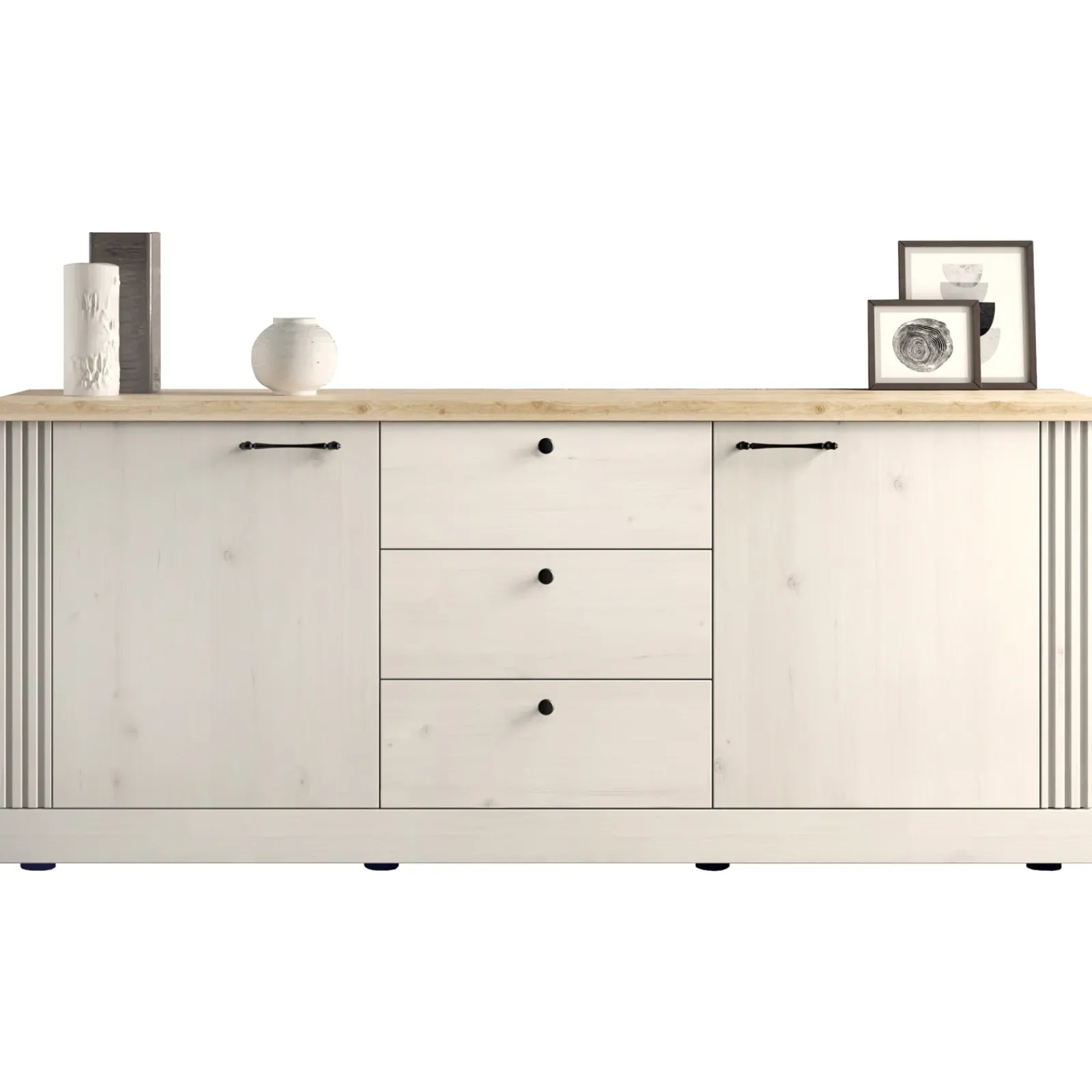 Dotata di 2 ante con 4 ampi vani interni e 3 pratici cassetti, Doria offre tutto lo spazio di cui hai bisogno per tenere in ordine stoviglie, accessori o documenti. Le maniglie in metallo aggiungono un tocco vintage, mentre i piedini neri garantiscono stabilità e leggerezza al design.