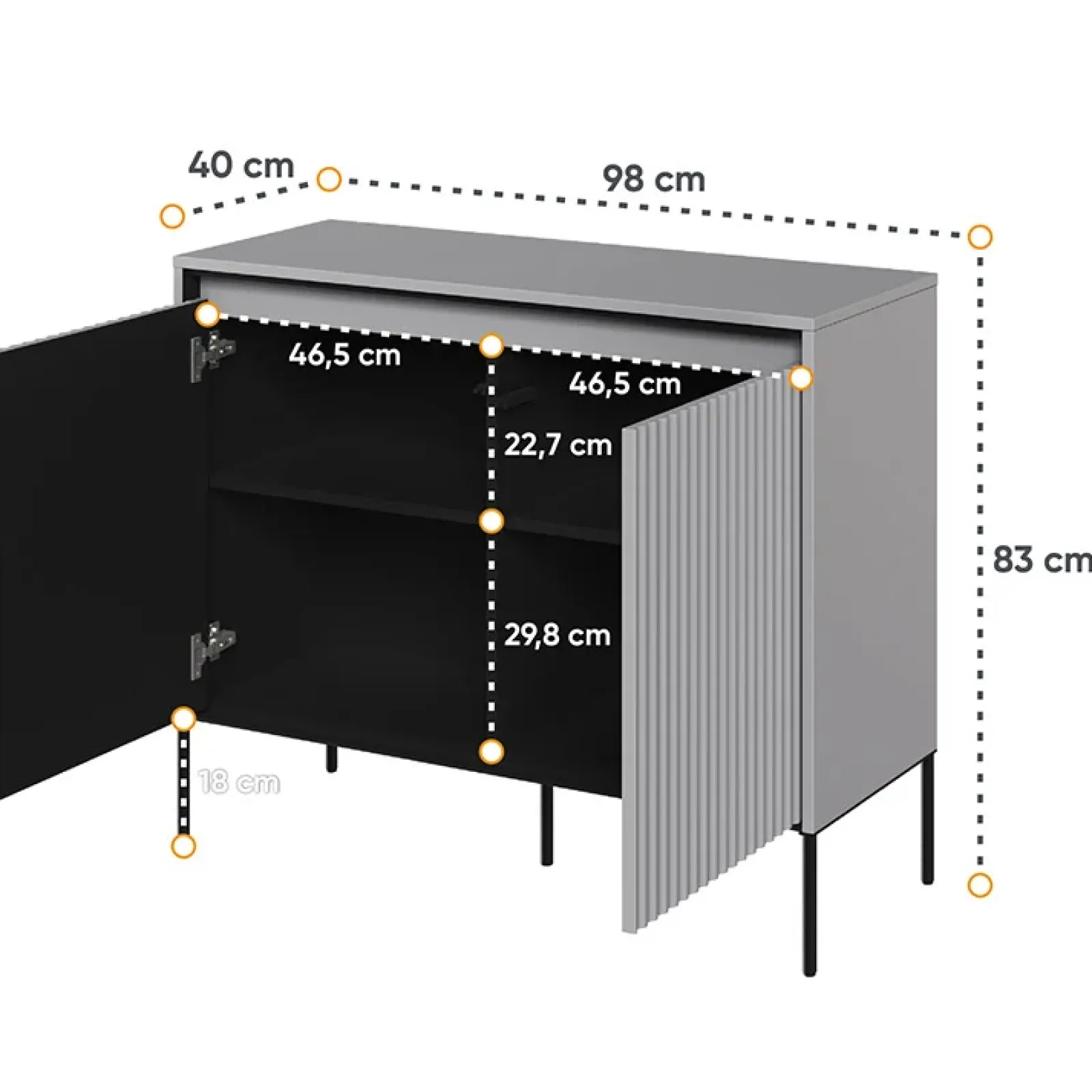 Una piccola madia sarà perfetta per quasi ogni stanza! Non solo ti fornirà spazio di archiviazione aggiuntivo, ma sarà anche un elemento decorativo unico nei tuoi interni. La piccola madia della collezione Camelia è la soluzione perfetta per chi ha bisogno di uno spazio di archiviazione pratico, ma dispone di poco spazio. Le sue dimensioni compatte la rendono ideale per ambienti piccoli come corridoi, ingressi o camerette dei bambini. Nonostante le sue piccole dimensioni, questa madia offre molto spazio per riporre gli oggetti. Puoi nascondere all’interno vestiti, accessori e piccoli oggetti, mantenendo così la tua casa ordinata e organizzata. Un elemento distintivo di questa madia sono i suoi frontali scanalati, che aggiungono fascino e carattere unici. È la scelta perfetta per chi apprezza il design originale e desidera arricchire il proprio spazio con consistenza e stile. La madia è sostenuta da gambe in metallo nero a contrasto, che conferiscono un aspetto leggero ed elegante. Il tutto è completato da una retroilluminazione discreta dei frontali, sotto forma di striscia LED. I colori della madia sono intramontabili e si adattano a diversi stili di arredamento, integrandosi perfettamente sia in interni moderni e minimalisti, sia in quelli classici o scandinavi.
