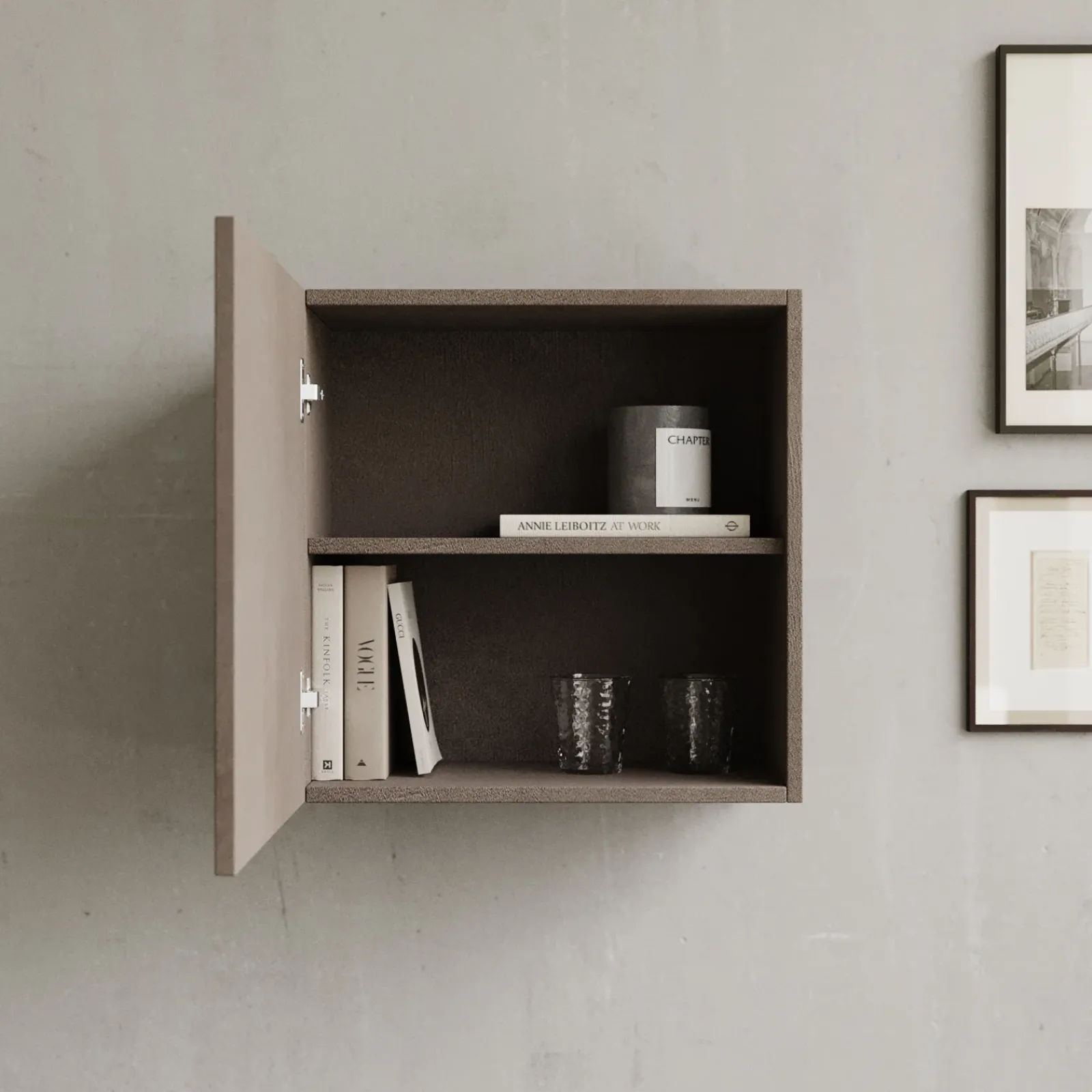 All’interno del cubo, un pratico ripiano crea due vani spaziosi, ideali per organizzare libri, oggetti decorativi, accessori o prodotti di uso quotidiano. L’anta battente è progettata per garantire un’apertura fluida e silenziosa, aggiungendo un tocco di raffinatezza.