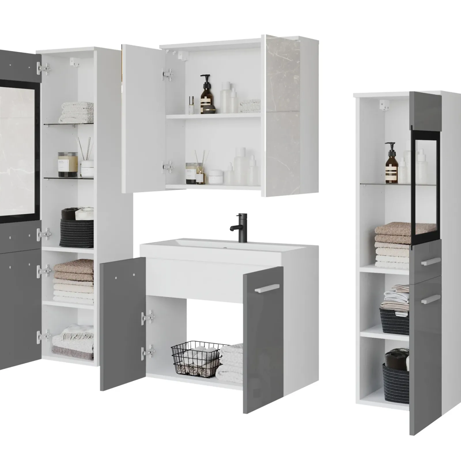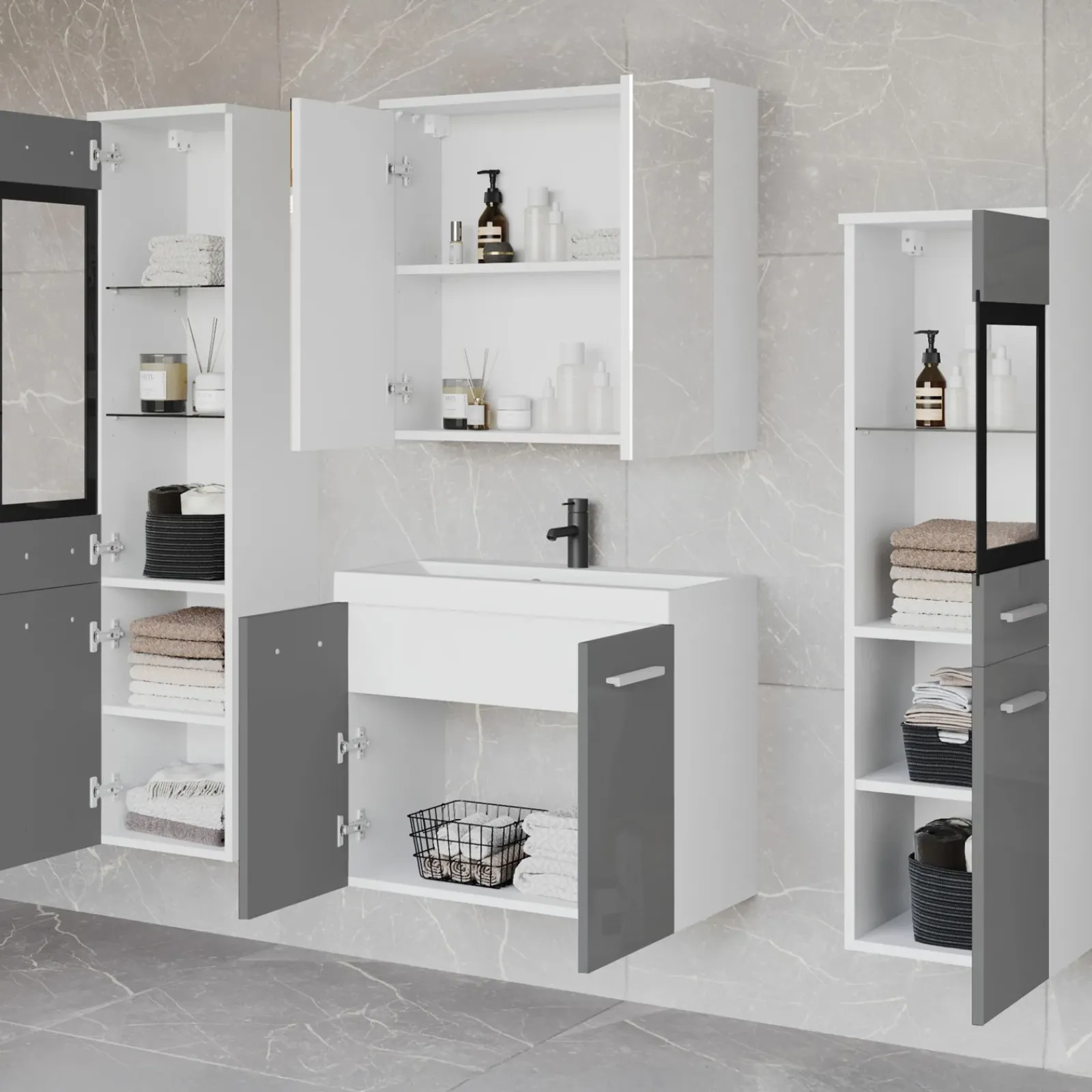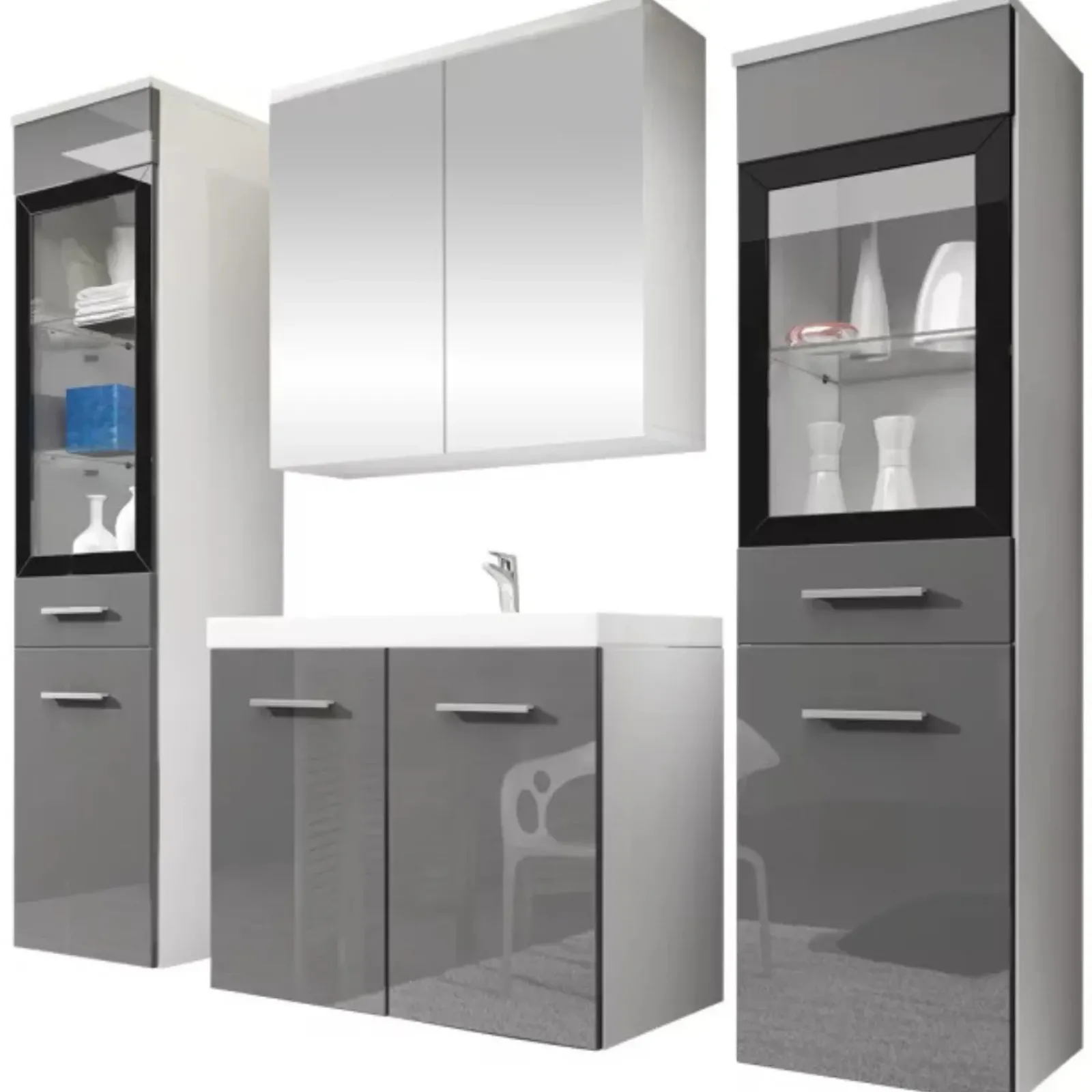 Garnero Arredamenti Mobile Bagno Sospeso-Mobile bagno sospeso 60cm con lavabo, specchio e 2 colonne grigio lucido bianco Luz Grigio – Bianco Lucido