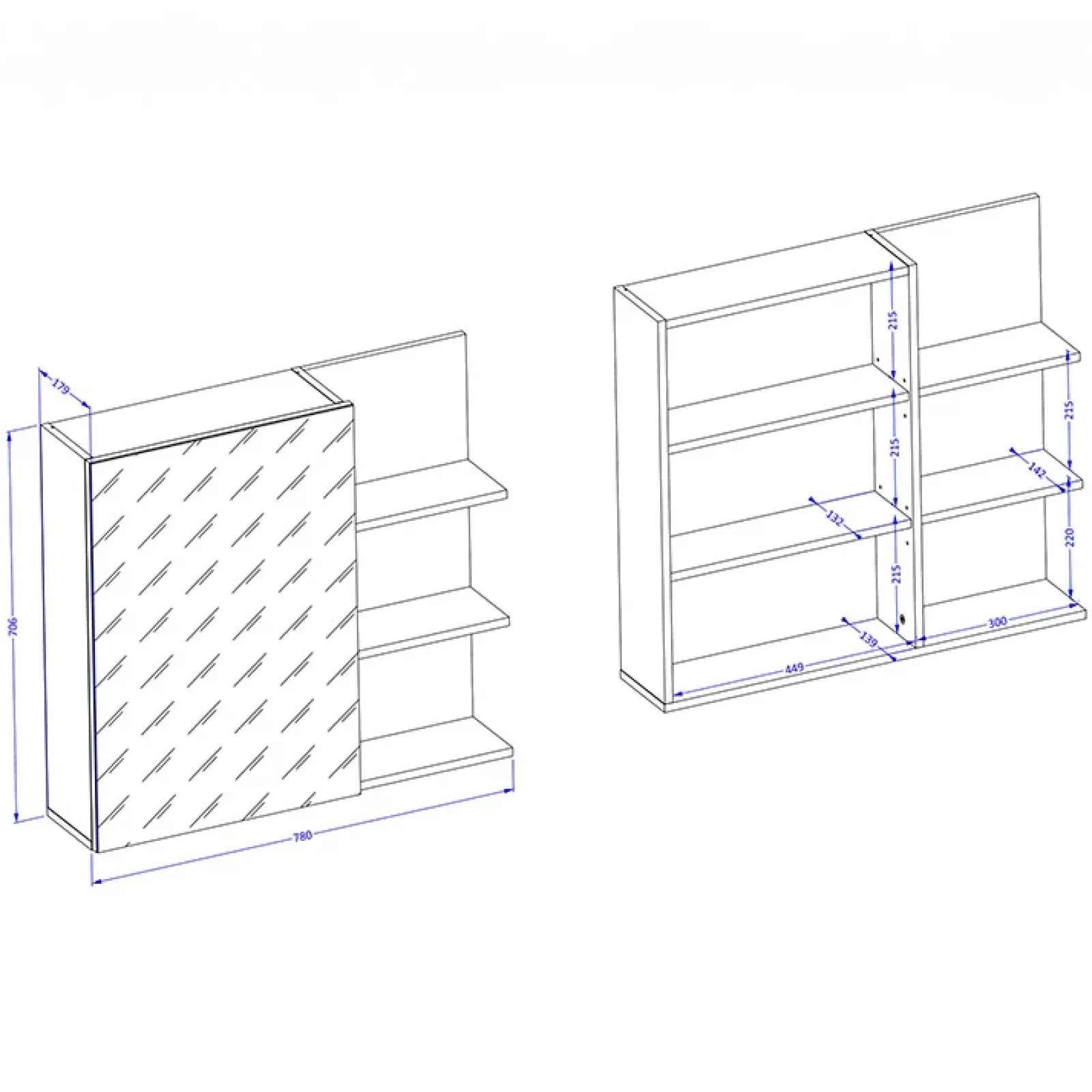 | Spessore ripiano | 3 ripiani 15 mm + ripiano centrale 32 mm / 3 mm schiena |