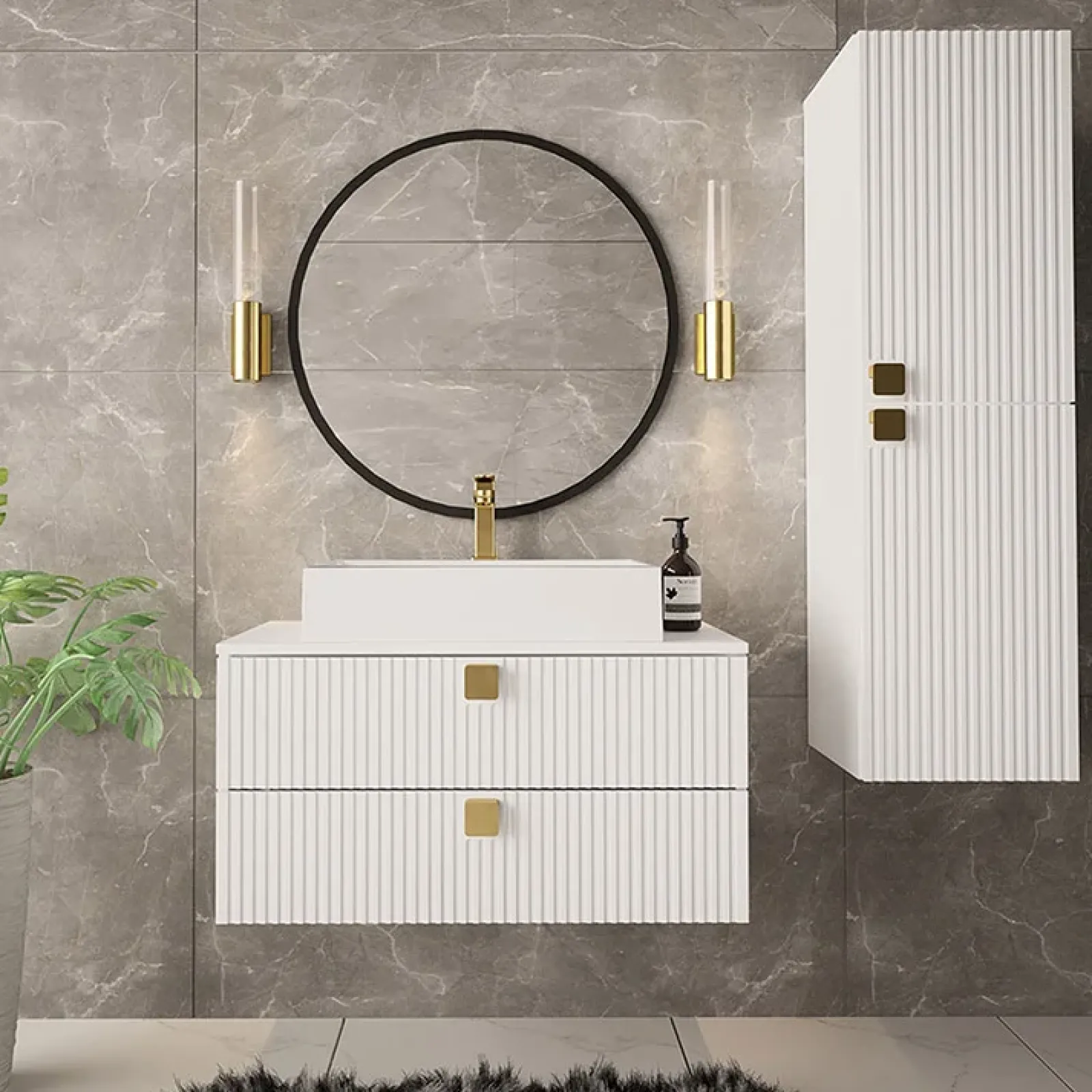 Mobile bagno sospeso 80cm maniglie oro bianco Bursa 2, caratterizzato da organizzazione e funzionalità grazie a ripiani e cassetti che permetteranno di riporre in ordine cosmetici e accessori vari.