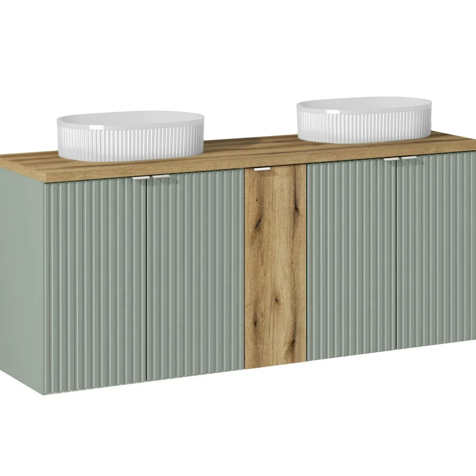 Mobile bagno sospeso cannettato 230cm con 2 lavabi, base sospesa e 4 pensili verde salvia rovere Greeny