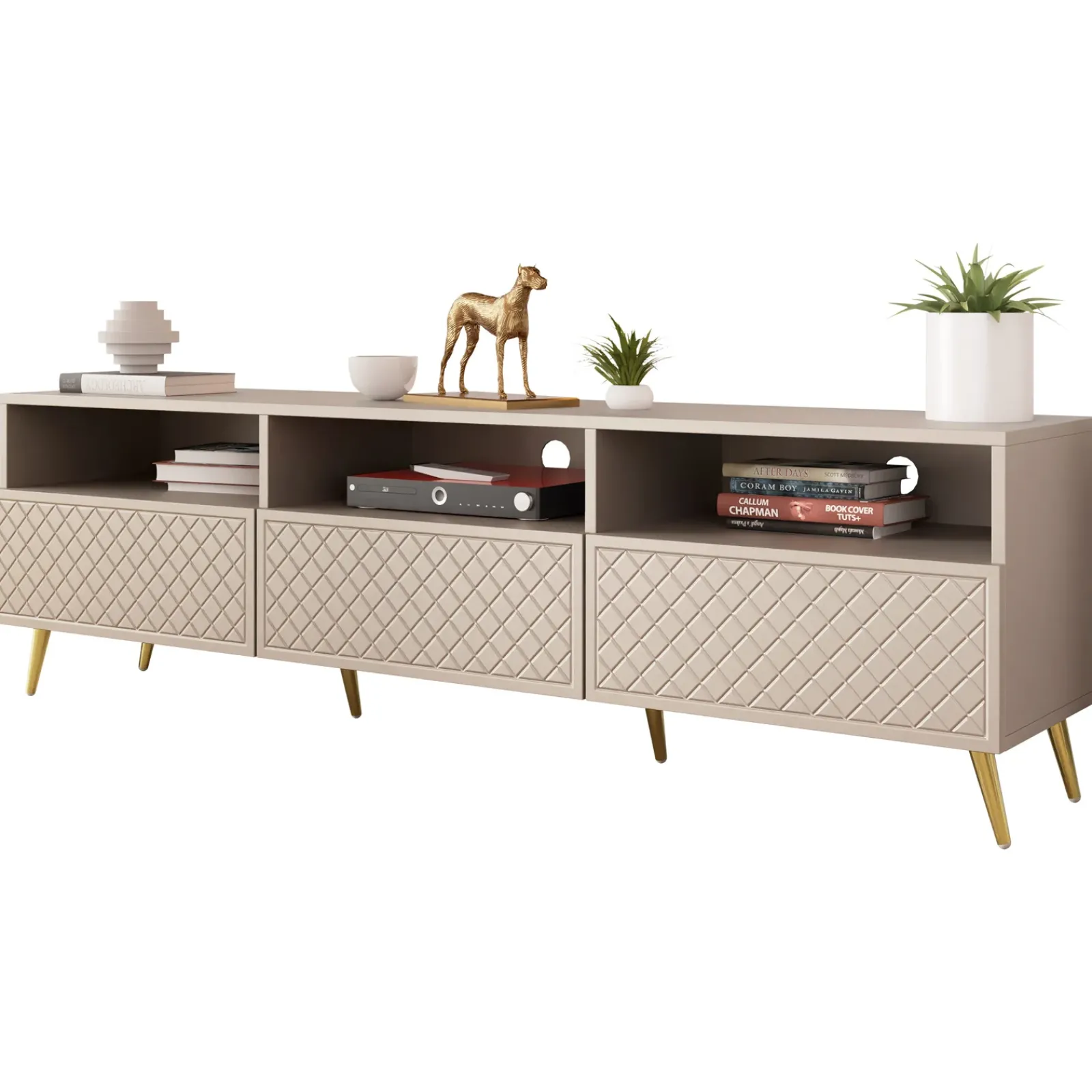 Cerchi un mobile che combini eleganza e funzionalità, capace di ospitare una TV di grandi dimensioni e di offrire ampio spazio per tutti i tuoi dispositivi e accessori? Il Mobile Porta TV 3 Ante 3 Vani Simona è la soluzione ideale per te! Con il suo design imponente e raffinato, questo mobile trasforma il tuo soggiorno in un ambiente elegante e ben organizzato. Realizzato in finitura beige con frontali serigrafati, questo mobile unisce un look moderno e sofisticato, aggiungendo un tocco di classe al tuo spazio.La sua ampia superficie è perfetta per ospitare TV di grandi dimensioni, diventando il fulcro del tuo soggiorno, e offrendo allo stesso tempo spazio in abbondanza per tenere tutto in ordine, senza rinunciare allo stile. Le tre ante a ribalta nascondono tre vani spaziosi, ideali per riporre dispositivi elettronici, giochi, accessori per la TV, o qualsiasi altro oggetto che desideri tenere in ordine e fuori dalla vista. Il sistema push to open consente di aprire le ante in modo semplice e intuitivo, senza ingombro di maniglie, per un aspetto pulito e contemporaneo. In aggiunta, il mobile offre tre vani a giorno, perfetti per sistemare console, decoder, lettori multimediali o altri dispositivi tecnologici, tenendo tutto a portata di mano e facilmente accessibile. Grazie ai fori passacavi integrati, potrai gestire con semplicità i cavi, mantenendo l’ordine e l’estetica impeccabili. Il mobile poggia su piedini in metallo dorato, che gli conferiscono una nota di raffinatezza e una stabilità superiore, sollevandolo dal pavimento e aggiungendo un tocco di eleganza contemporanea. Perfetto per arredare soggiorni moderni o dallo stile più classico, questo mobile non è solo un complemento d’arredo funzionale, ma un vero e proprio elemento di design che valorizza ogni ambiente. Scegli il Mobile Porta TV 3 Ante 3 Vani Simona: un pezzo unico che combina bellezza, praticità e una capienza straordinaria, rendendo il tuo soggiorno più organizzato e stiloso che mai!
