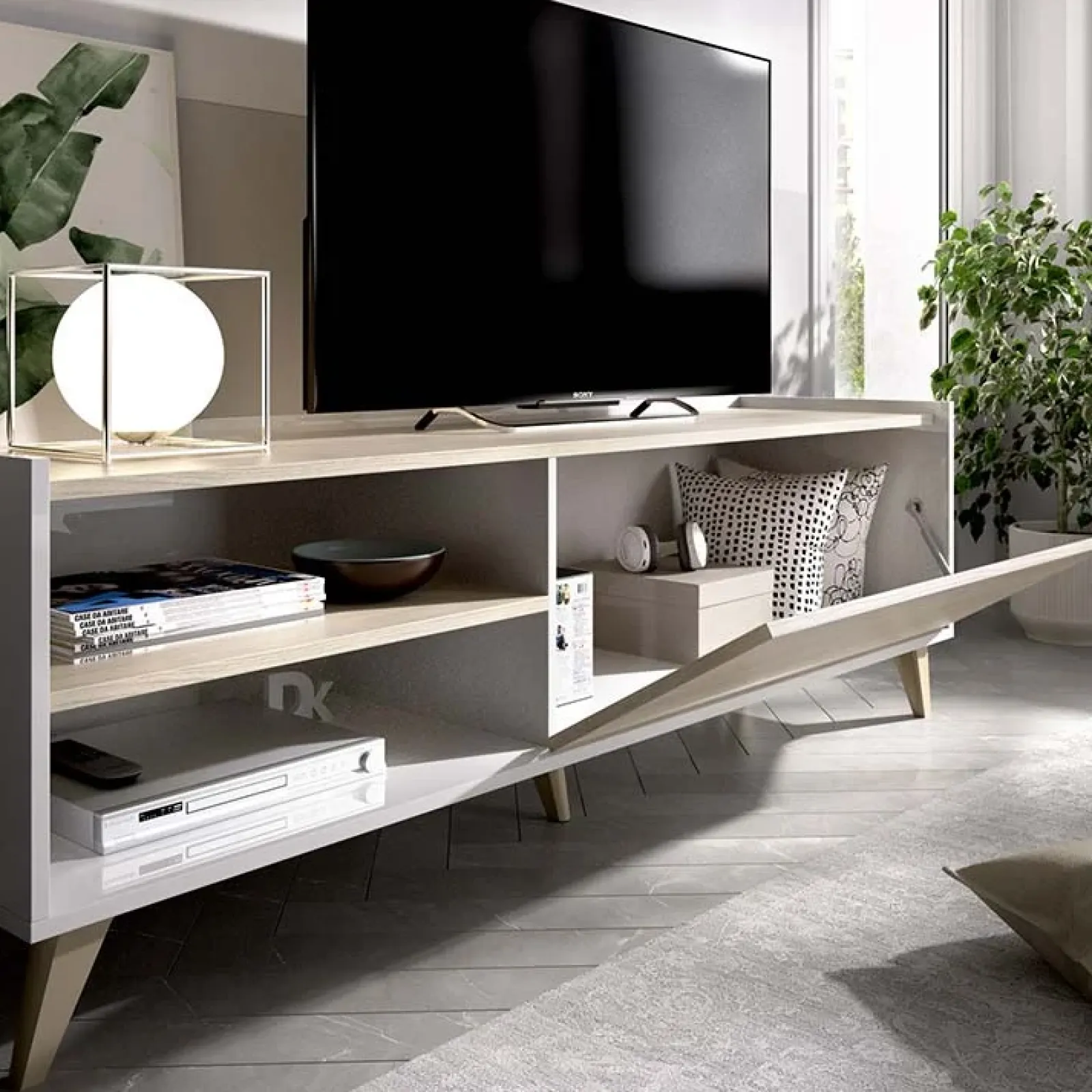 Il mobile porta tv è composto da: un’anta a ribalta con due vani a giorno, spazio ideale per riporre tutto il materiale multimediale.