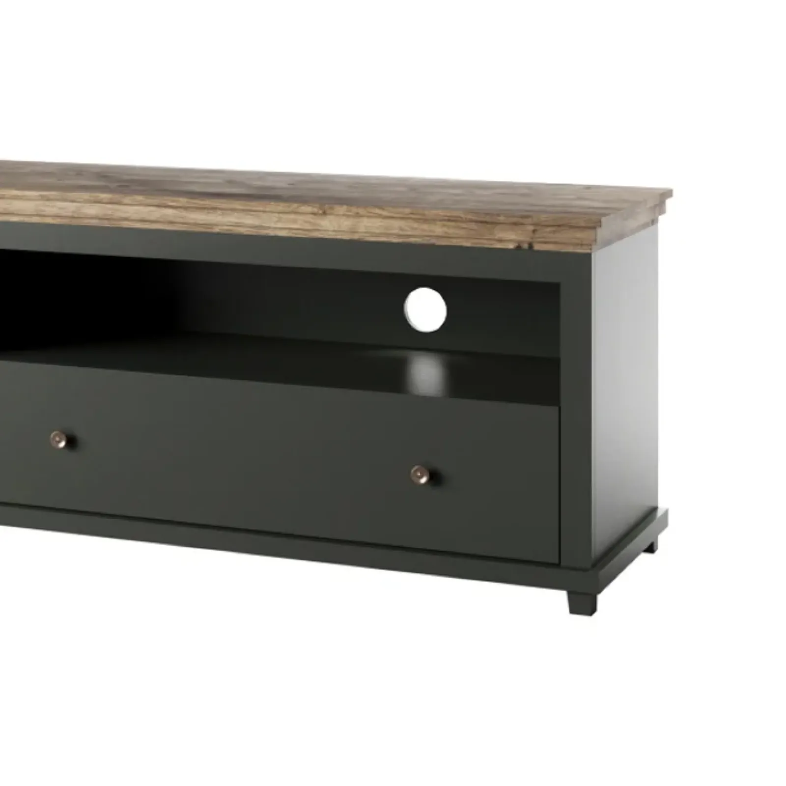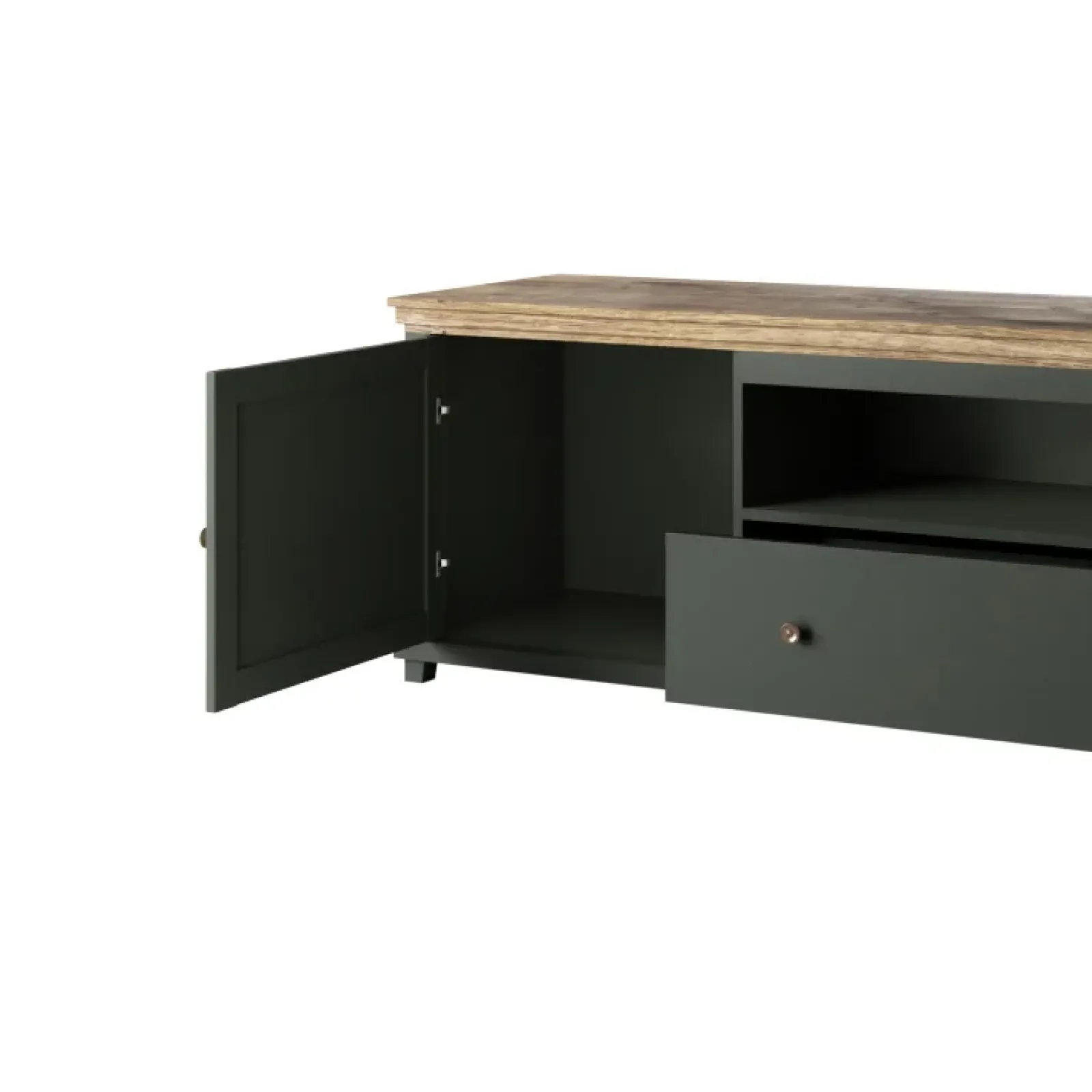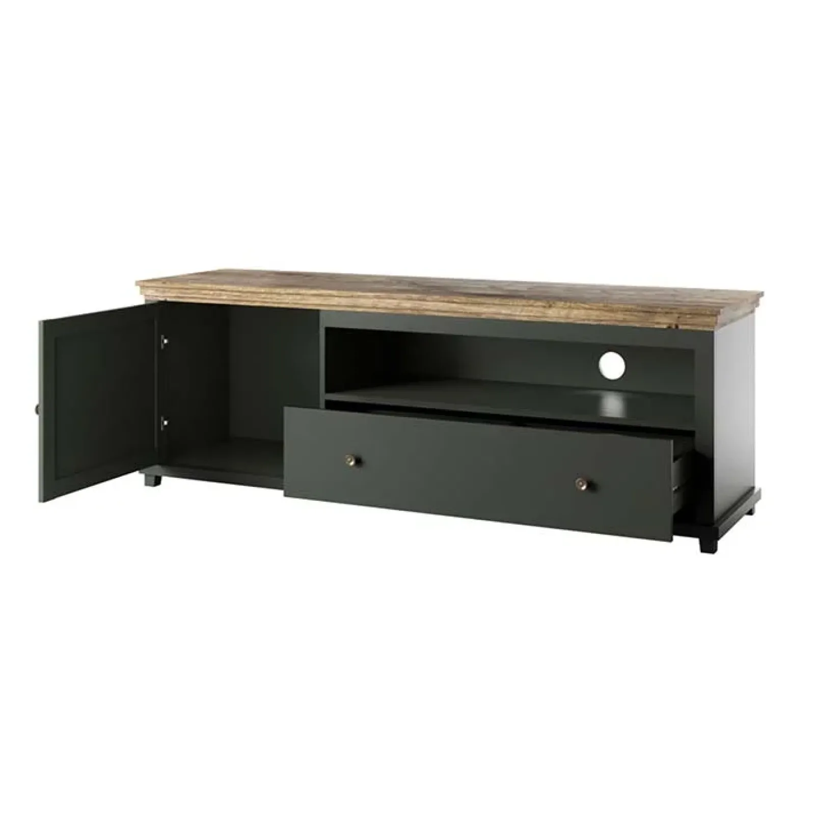 Il porta tv Texel 1 anta 1 cassetto dona un’atmosfera rustica e calorosa alla tua zona relax: il verde scuro, combinato con la calda finitura quercia e l’effetto ottone dei pomelli, crea una combinazione unica, dedicata agli amanti dell’eleganza.