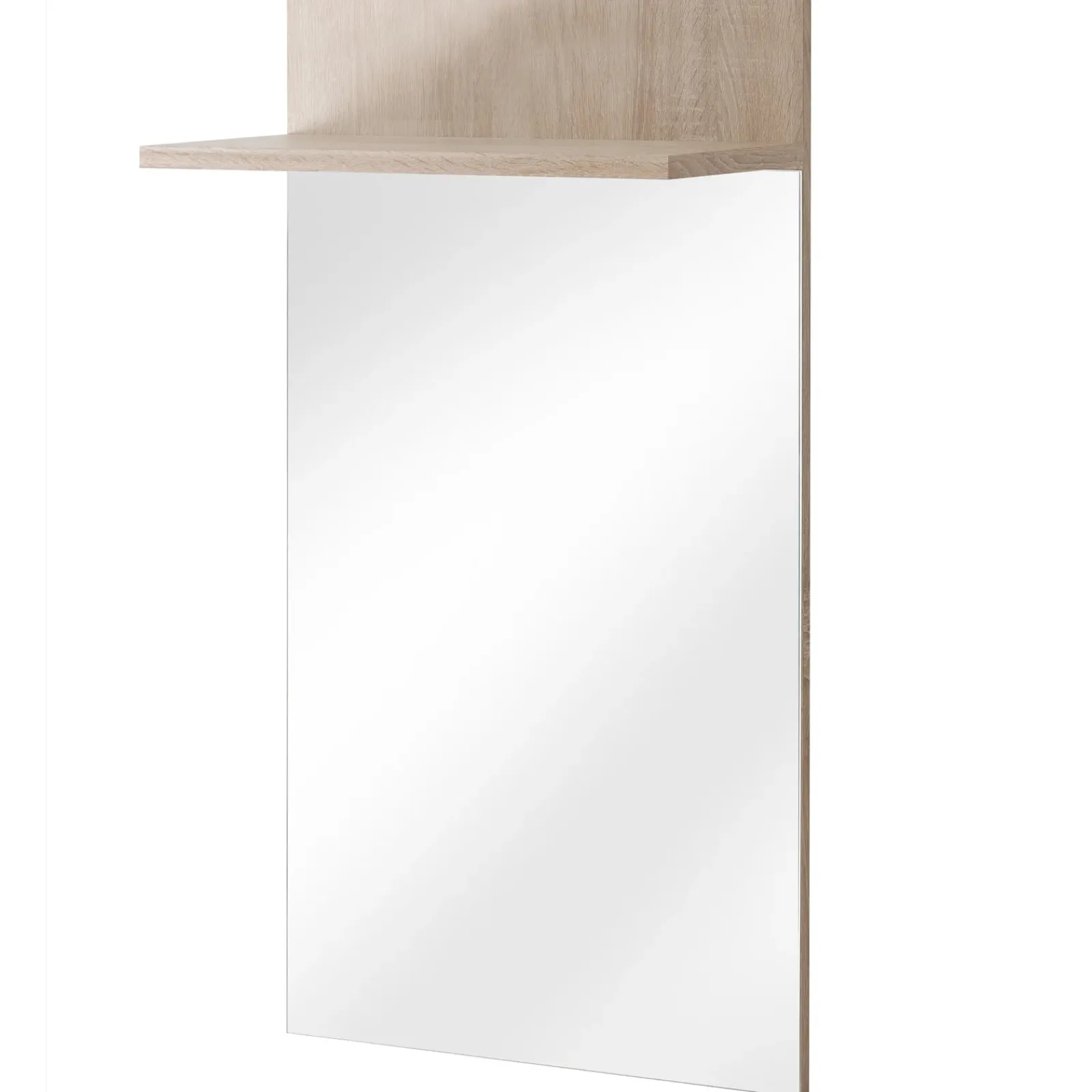 E’ composto da un mobiletto basso dotato di due ante battenti e ripiano interno, con seduta; un mobiletto con cassetto e due ante battenti, con due ripiani interni; un pannello pensile con mensola superiore, un’asta appendiabiti e due ganci appendiabiti; ed infine un pannello pensile con mensola superiore e specchio.