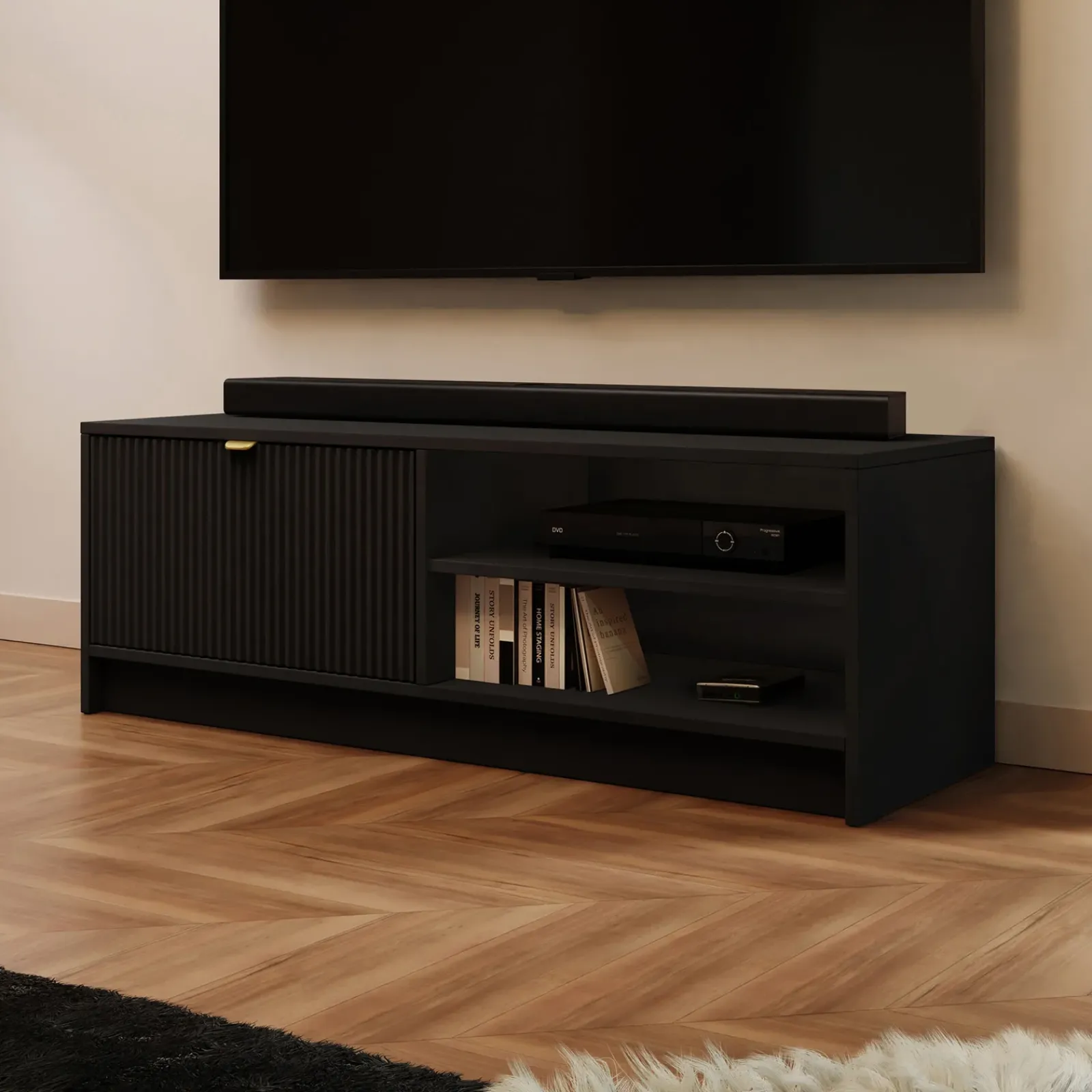 Il mobile porta TV Athena è un pezzo d’arredo elegante e di grande impatto, pensato per chi cerca uno stile contemporaneo e raffinato. La finitura nero opaco conferisce al mobile un aspetto sofisticato e moderno, mentre il frontale cannettato aggiunge una texture delicata e unica. Il mobile porta tv è dotato di un’anta a ribalta, che si apre comodamente per offrire spazio di contenimento, ideale per riporre dispositivi elettronici o altri oggetti. La maniglia color oro sull’anta a ribalta aggiunge un accento di lusso, creando un raffinato contrasto con la superficie nera e conferendo al mobile un tocco di classe. Accanto all’anta, il mobile presenta due vani a giorno, perfetti per esporre oggetti decorativi, libri o dispositivi tecnologici, mantenendo allo stesso tempo l’area TV in ordine. Il design del mobile porta TV Athena è ideale per soggiorni, salotti o zone living moderne, dove può diventare il protagonista dell’ambiente, unendo raffinatezza e praticità con un design pulito e contemporaneo.