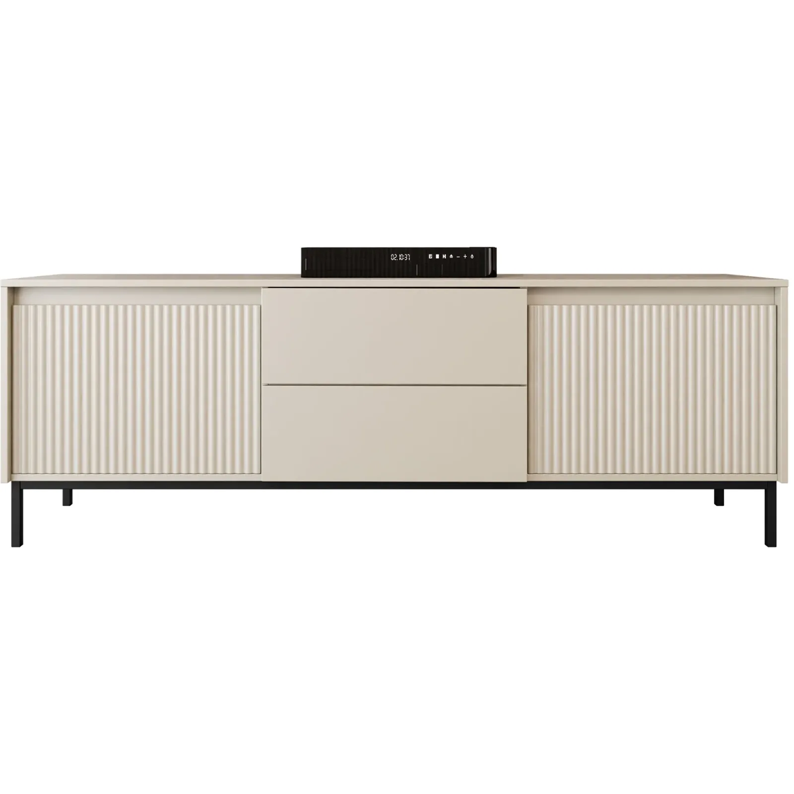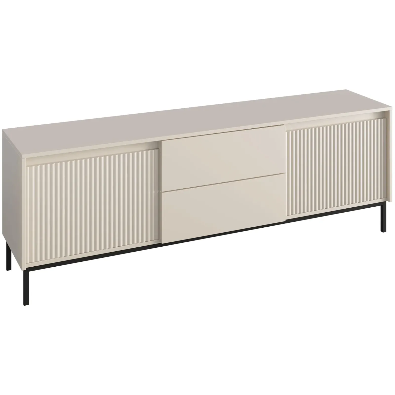 Il mobile porta TV Strike è un pezzo d’arredo sofisticato e moderno, pensato per chi cerca un design elegante e funzionale. La finitura beige dona al mobile un aspetto caldo e accogliente, mentre il frontale cannettato delle due ante a ribalta crea un bellissimo contrasto visivo, con una texture che gioca con la luce e aggiunge un tocco di dinamismo al design complessivo. Le ante a ribalta offrono un ampio spazio di contenimento, ideale per riporre dispositivi elettronici, cavi e altri oggetti, mantenendo l’area TV ordinata e funzionale. Il mobile porta TV Strike è dotato di due cassetti centrali, perfetti per riporre oggetti più piccoli o per tenere nascosti accessori e altri articoli, mantenendo l’ambiente pulito e organizzato. I piedini sottili neri sollevano il mobile dal pavimento, creando un contrasto elegante con la finitura beige e conferendo al mobile una sensazione di leggerezza e modernità. Questo dettaglio dona al mobile porta TV Strike un aspetto sofisticato, rendendolo perfetto per soggiorni, salotti o zone living dove si desidera un mobile che sia allo stesso tempo bello, pratico e con un tocco di lusso discreto.