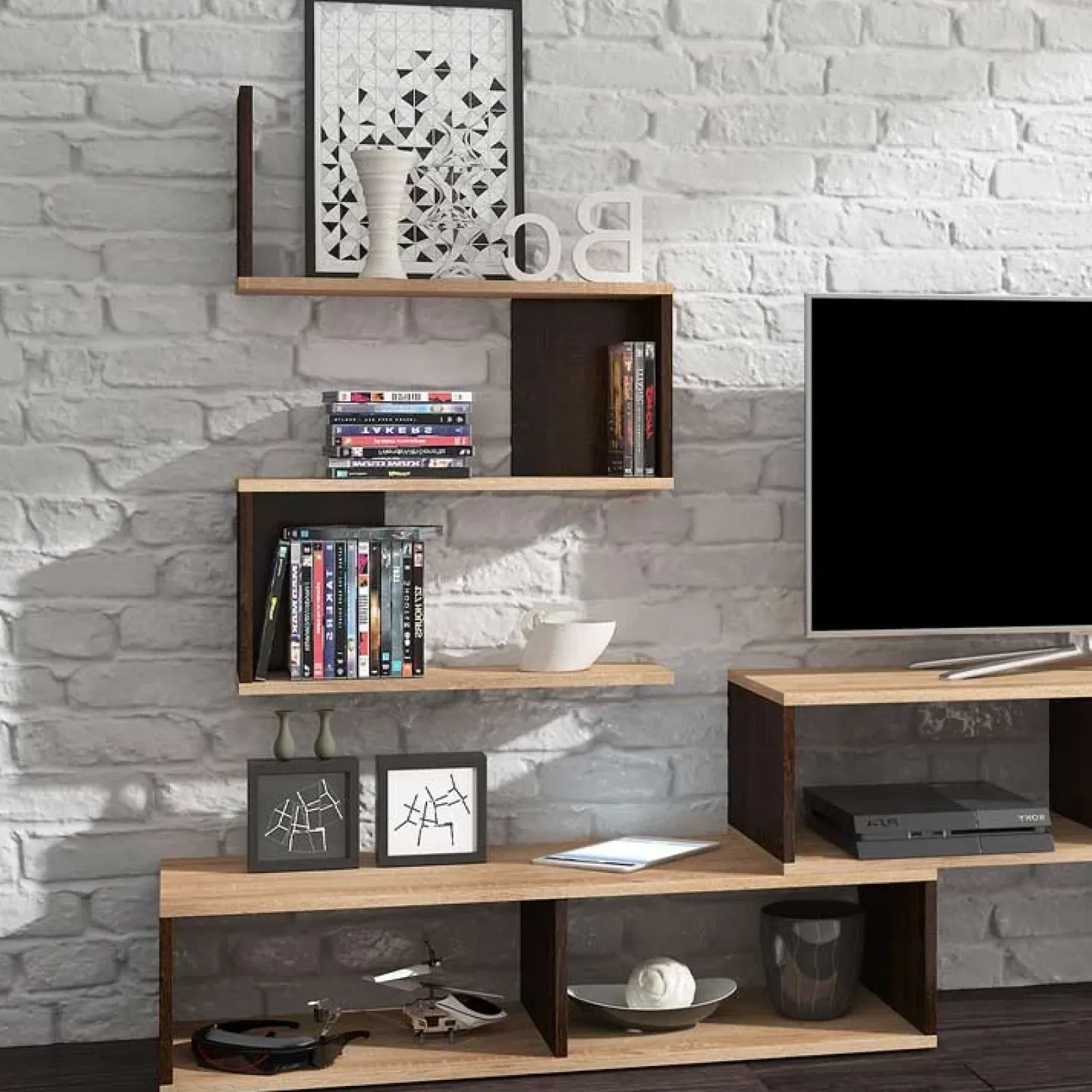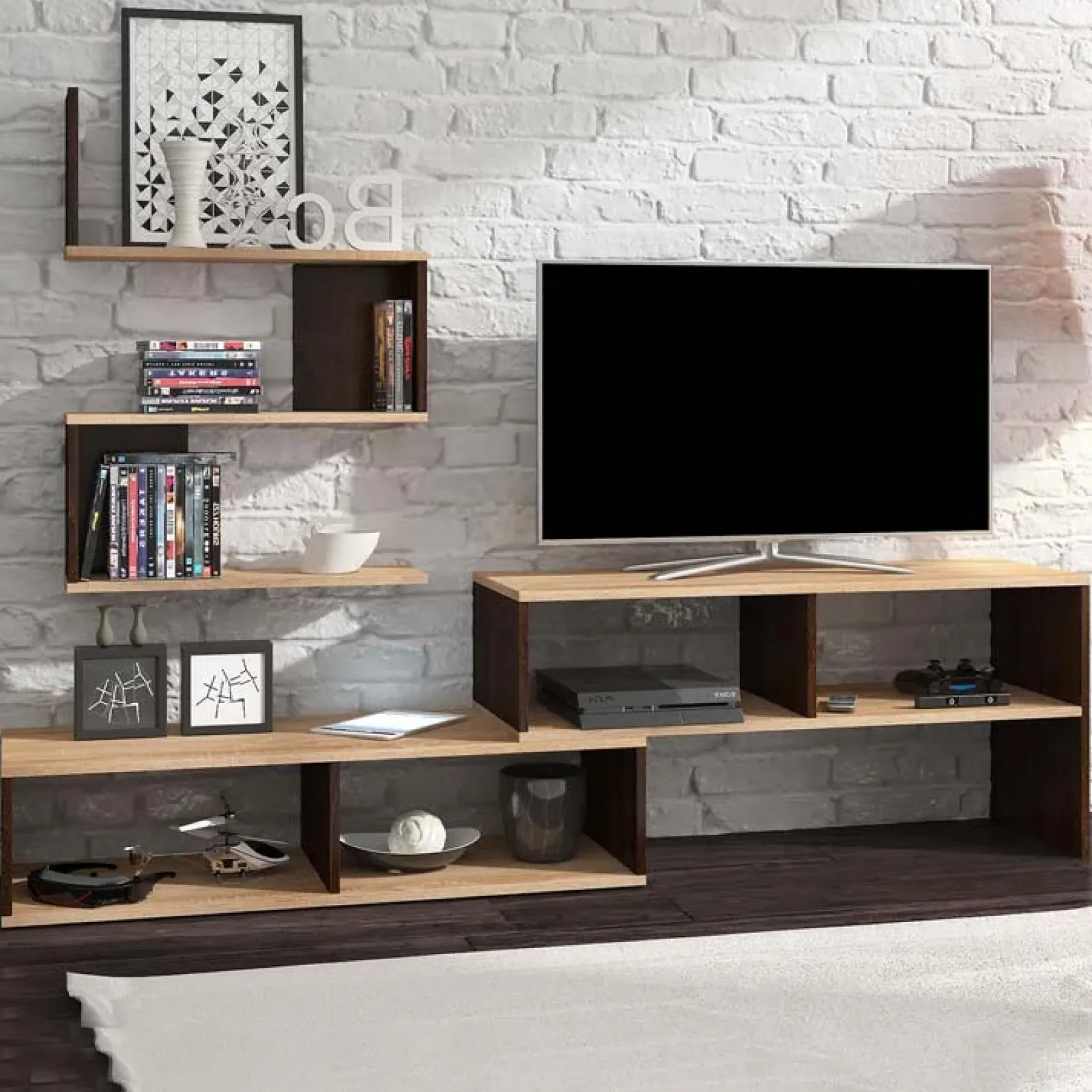 Essa è composta da un piano principale ottimo utilizzato come base porta TV, con spaziosi ripiani a giorno per mostrare i souvenir dei tuoi meravigliosi viaggi e da un pratico scaffale per mostrare a tutti la tua collezione di cd, libri e dvd.
