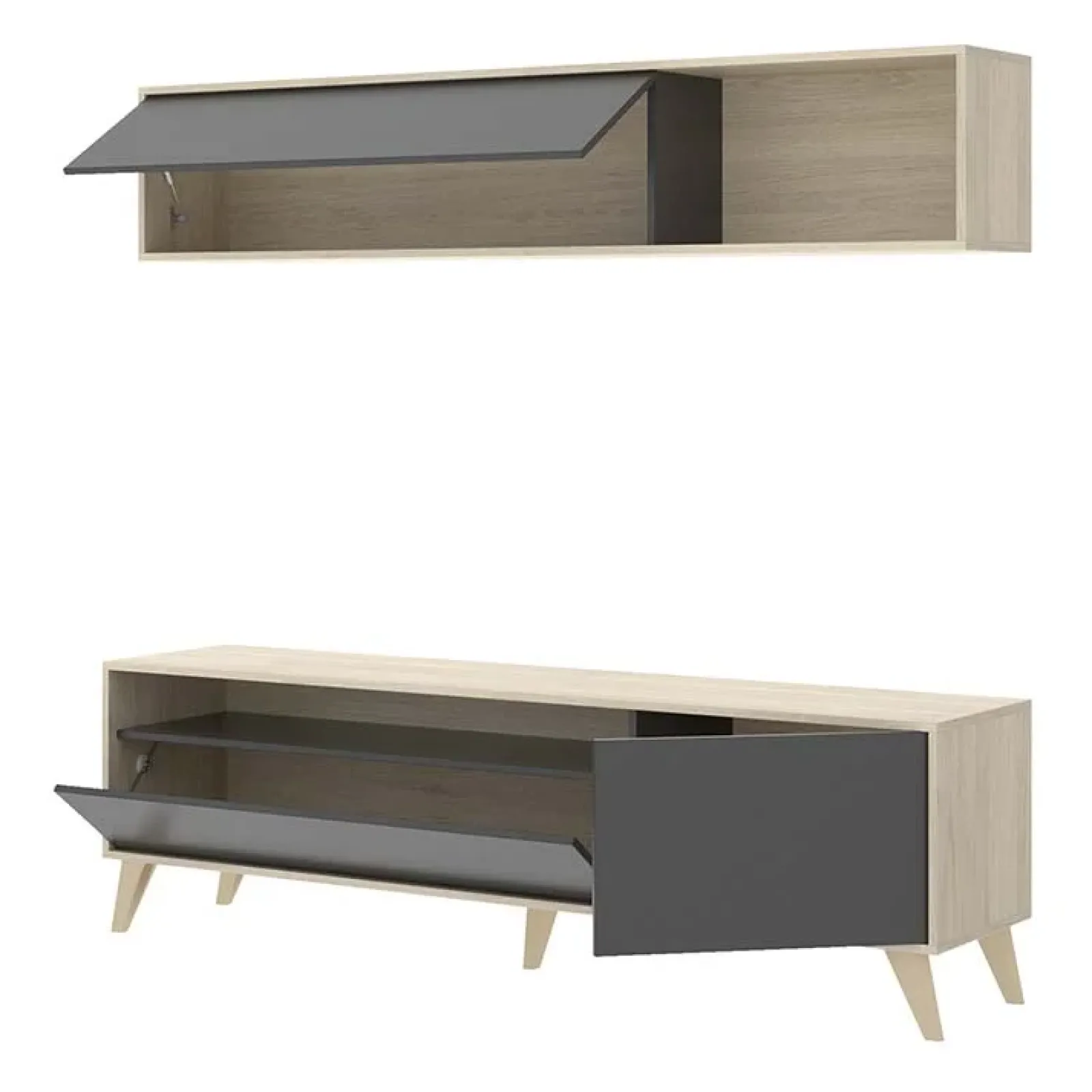 La composizione è composta da un mobile porta tv con un modulo sospeso, questi elementi permettono di organizzare al meglio ogni spazio della zona living.