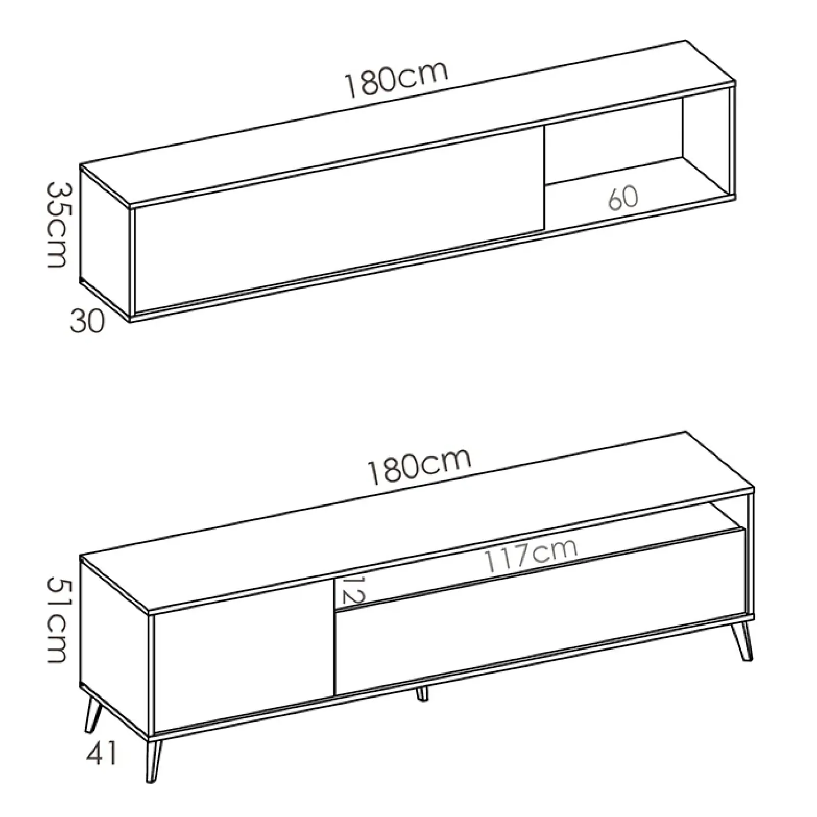 - Dimensioni mobile porta tv: L.180 x P.41 x H.51 cm