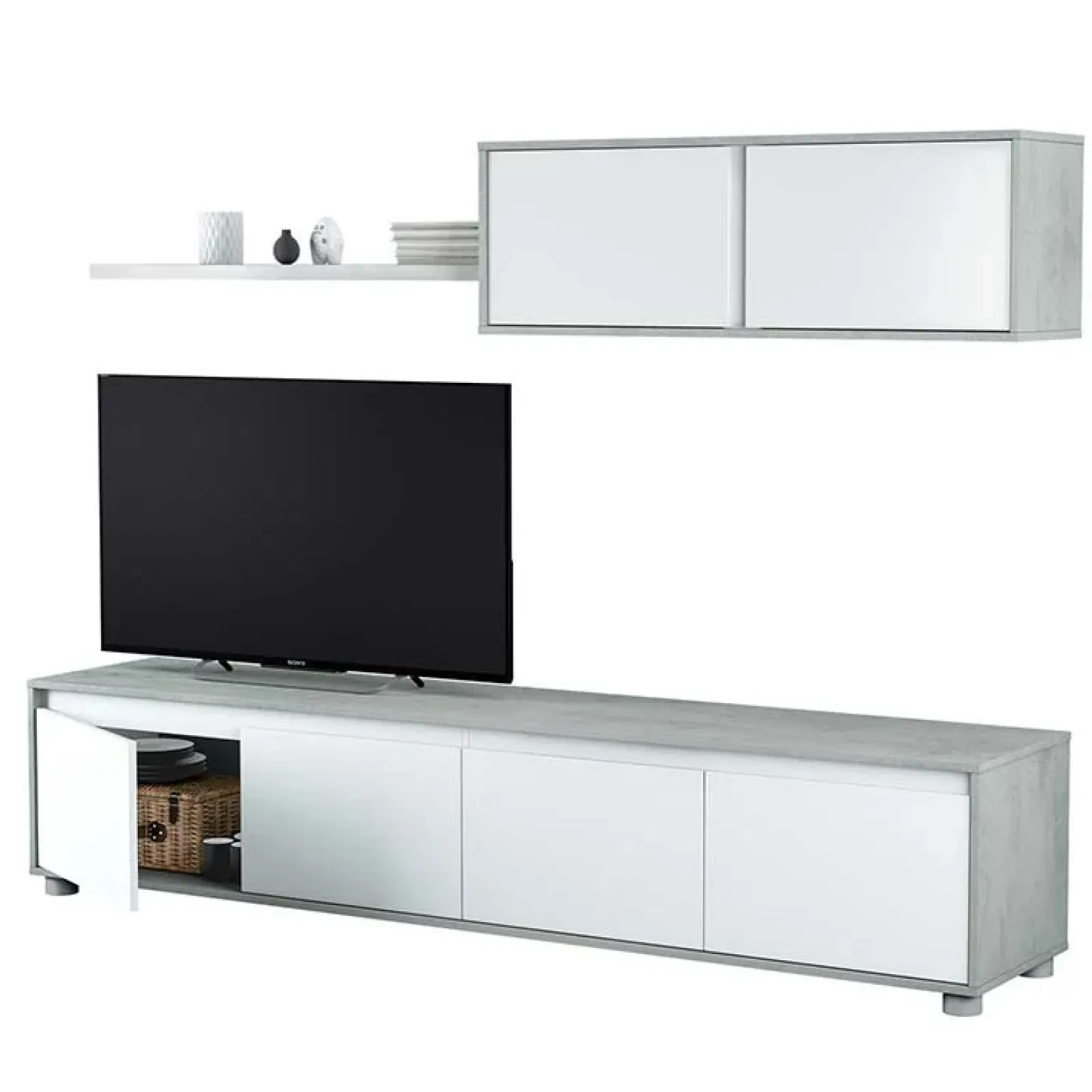 Itaca è una parete attrezzata caratterizzata dall’abbinamento bianco opaco e cemento molto di tendenza. Una soluzione di carattere, dallo stile moderno e intramontabile, perfetta per chi vuole impreziosire il proprio living in modo raffinato. E’ una composizione versatile, composta da una base porta tv composta da 4 ante battenti, un pensile a due ante e una pratica mensola per esporre tutti i tuoi oggetti preferiti.
