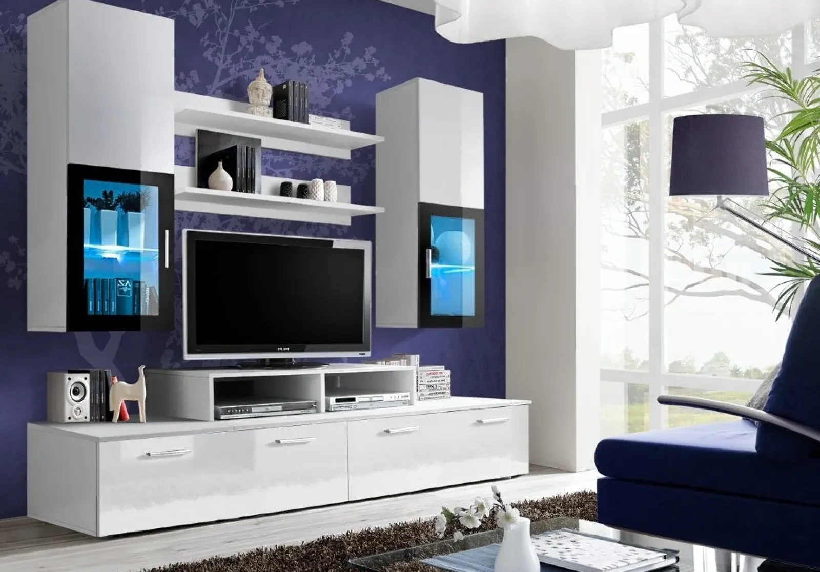 Parete attrezzata Orlando Gihome ® bianco lucido vetri neri.