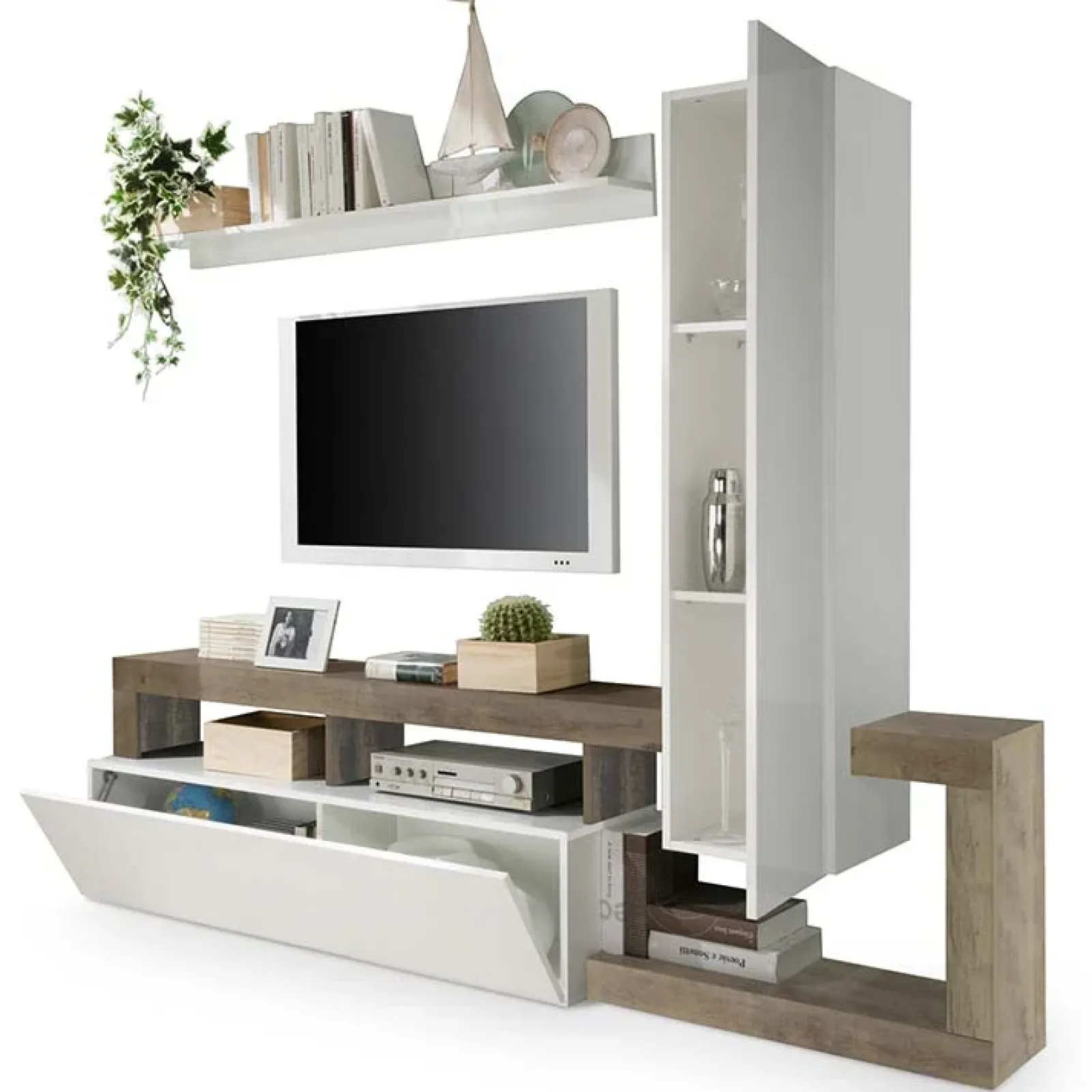 È composta da: 1 pensili verticale, con all’interno 2 ripiani, una mensola ed una base tv con anta a ribalta, tutti elementi coordinati e concepiti per offrire lo spazio di cui necessiti.