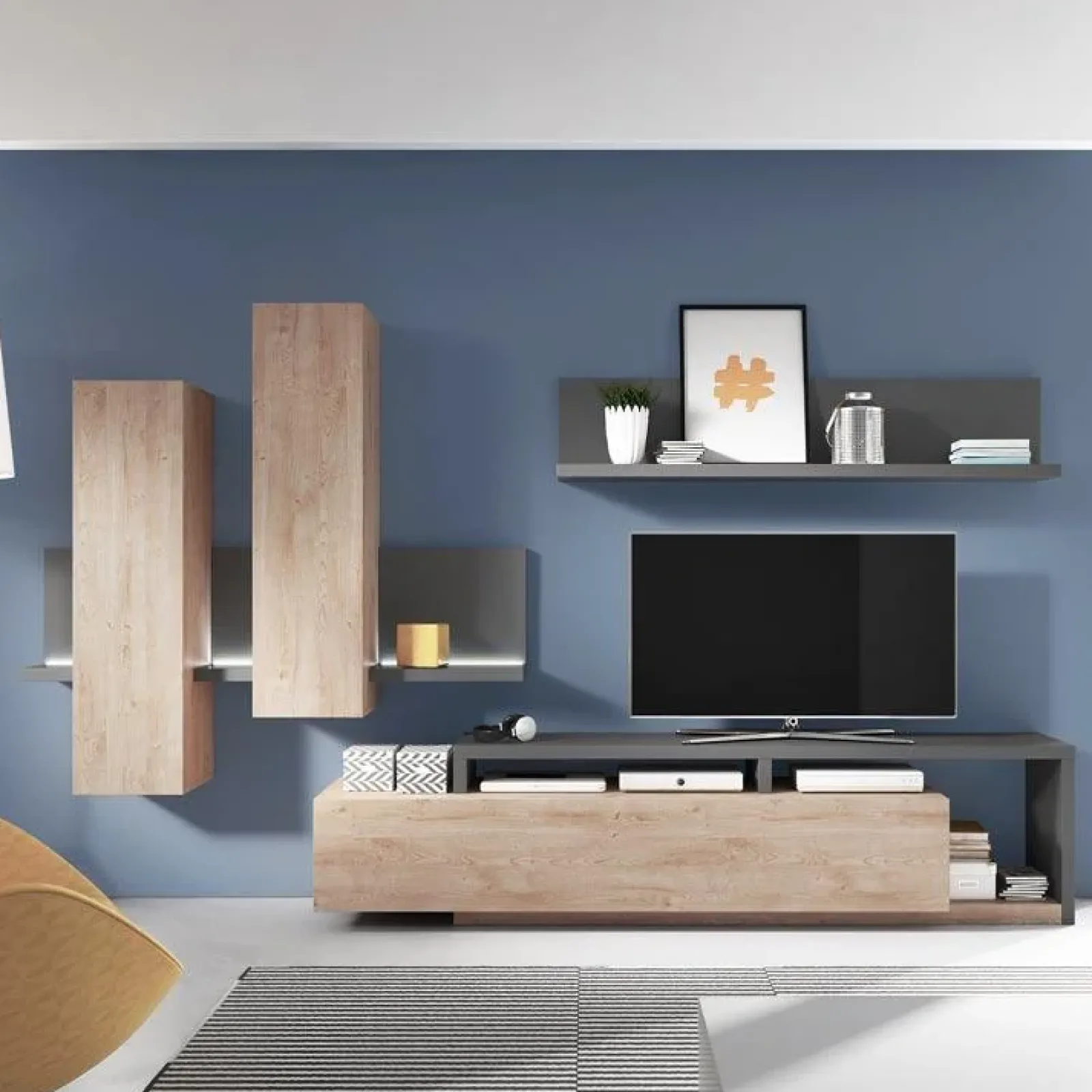 Minimal ed essenziale, con la sua forma geometrica il mobile tv conferisce dinamismo e ritmo alla parete attrezzata. E’ composto da un robusto ripiano antracite di spessore 38 mm che circonda la struttura color rovere, composta internamente da due cassetti a frontale unico. Il ripiano antracite crea dei vani a giorno dove potrai collocare i vari dispositivi elettronici collegati alla tv.