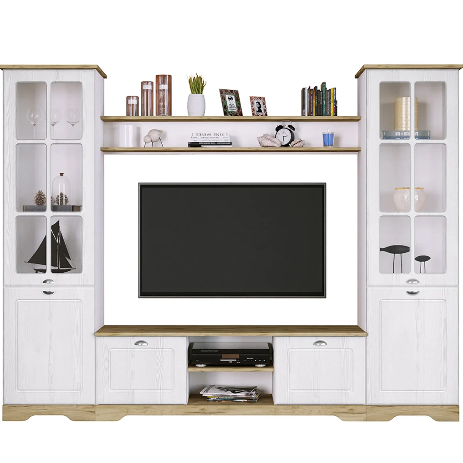 Garnero Arredamenti Parete Attrezzata A Terra|Pareti Attrezzate-Parete attrezzata 234x181h cm shabby soggiorno bianco opaco Loira