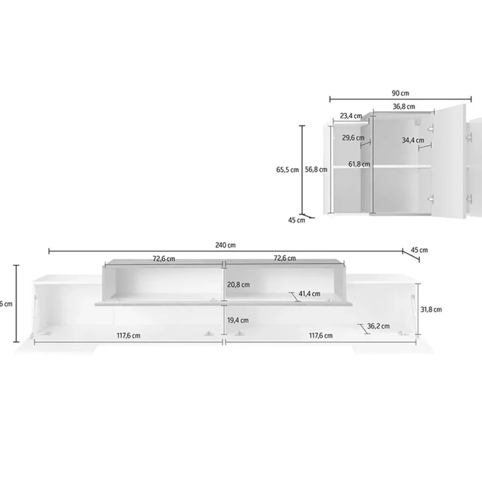 - Dimensioni porta TV: L. 240 x H. 51,6 x P. 45 cm