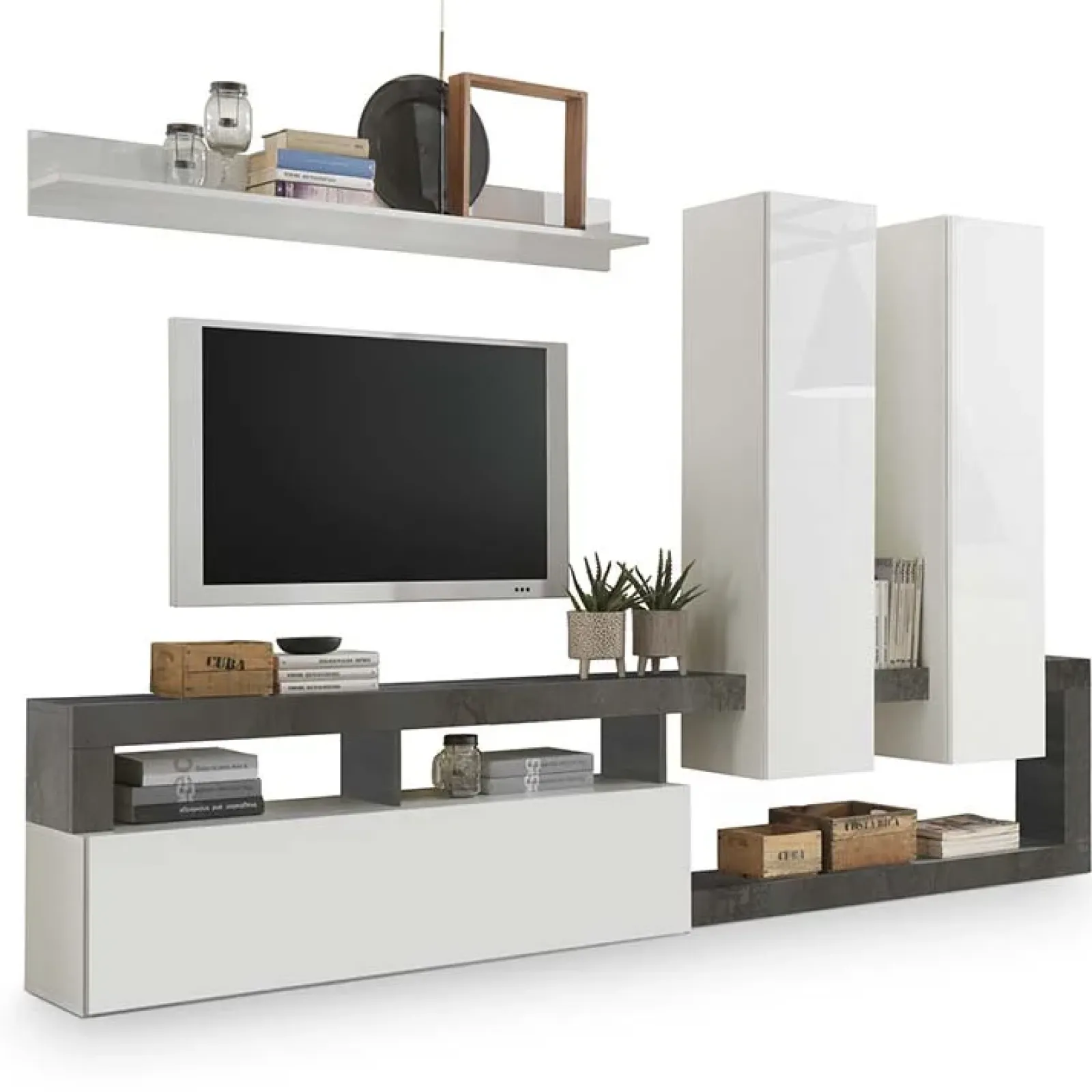 È composta da: 2 pensili verticali, al cui interno sono presenti 2 ripiani, una mensola ed una base tv con anta a ribalta, tutti elementi coordinati e concepiti per offrire lo spazio di cui necessiti.