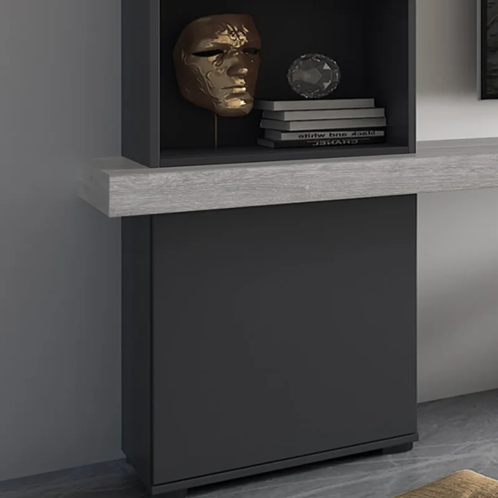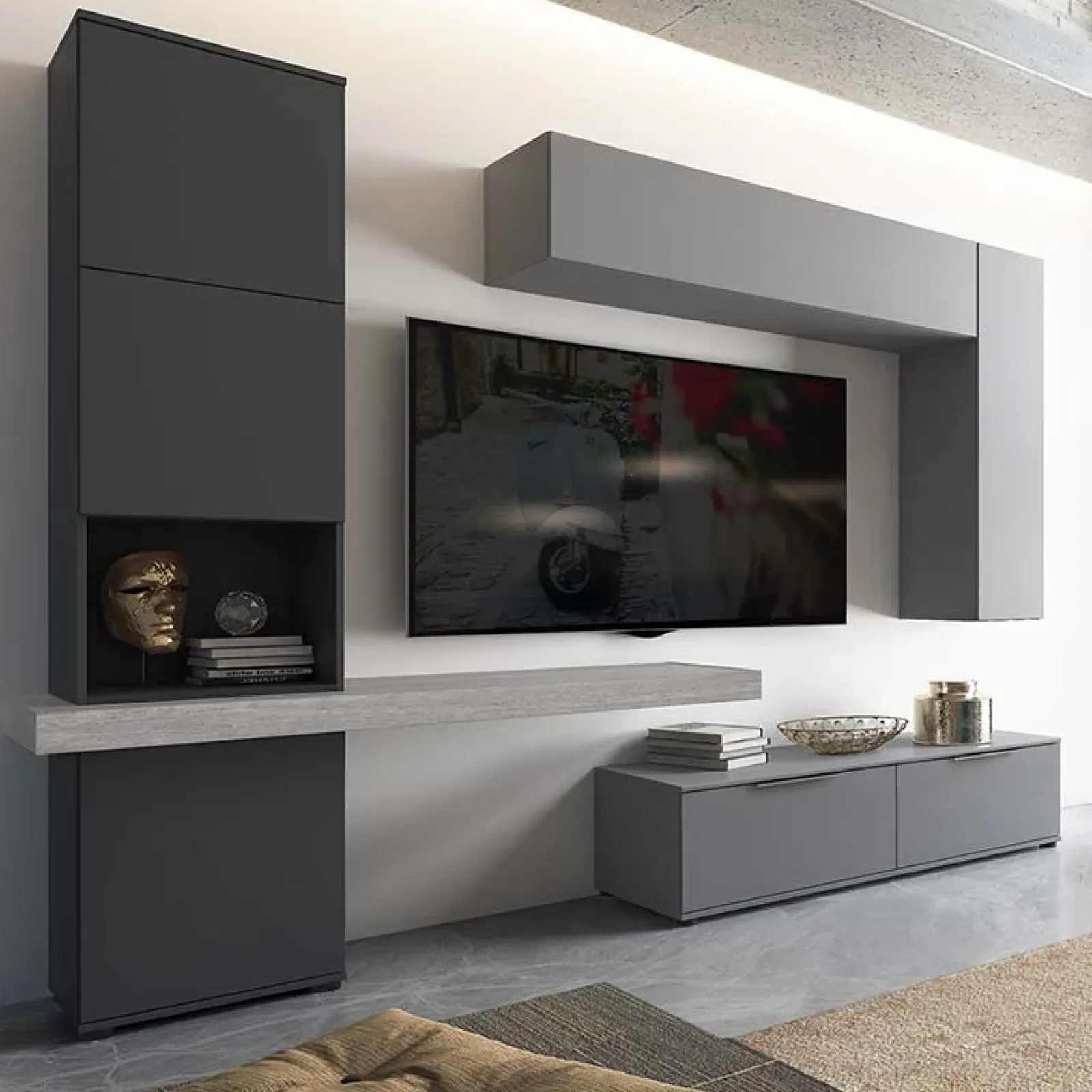 Universe è una bellissima parete attrezzata adatta per essere collocata in un soggiorno moderno. L’unione di colori come il grigio e l’antracite doneranno un carattere contemporaneo nell’ambiente in cui verrà inserita.