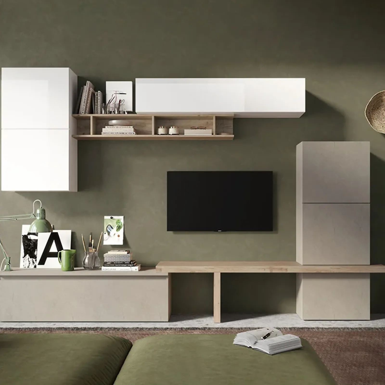 Sunset combina 4 cubi che presentano al proprio interno due ripiani nascosti da un’anta battente, 1 cubo a terra, anche’esso con un’anta battente, 1 mensola con vani a giorno, un’ ulteriore mensola, un pensile orizzontale sospeso diviso in due vani, che ti offre la possibilità di montaggio dell’anta a vasistas o a ribalta ed infine 1 mobile porta tv con cassettoni per riporre tutte le apparecchiature elettroniche.