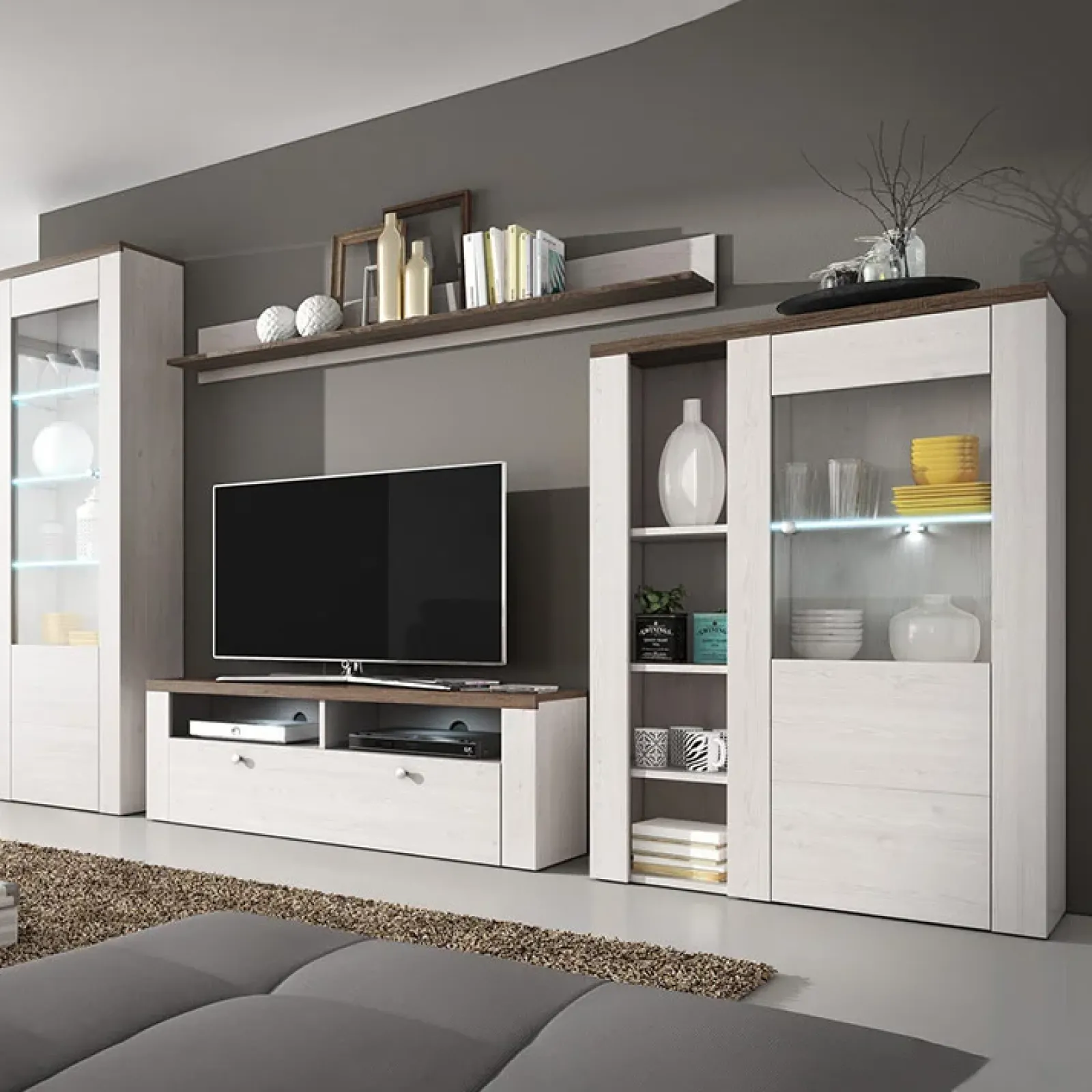 La parete attrezzata Paloma nella finitura pino bianco rovere è apprezzata per l’estrema adattabilità, così da potersi integrare perfettamente in molteplici idee di stile e design.