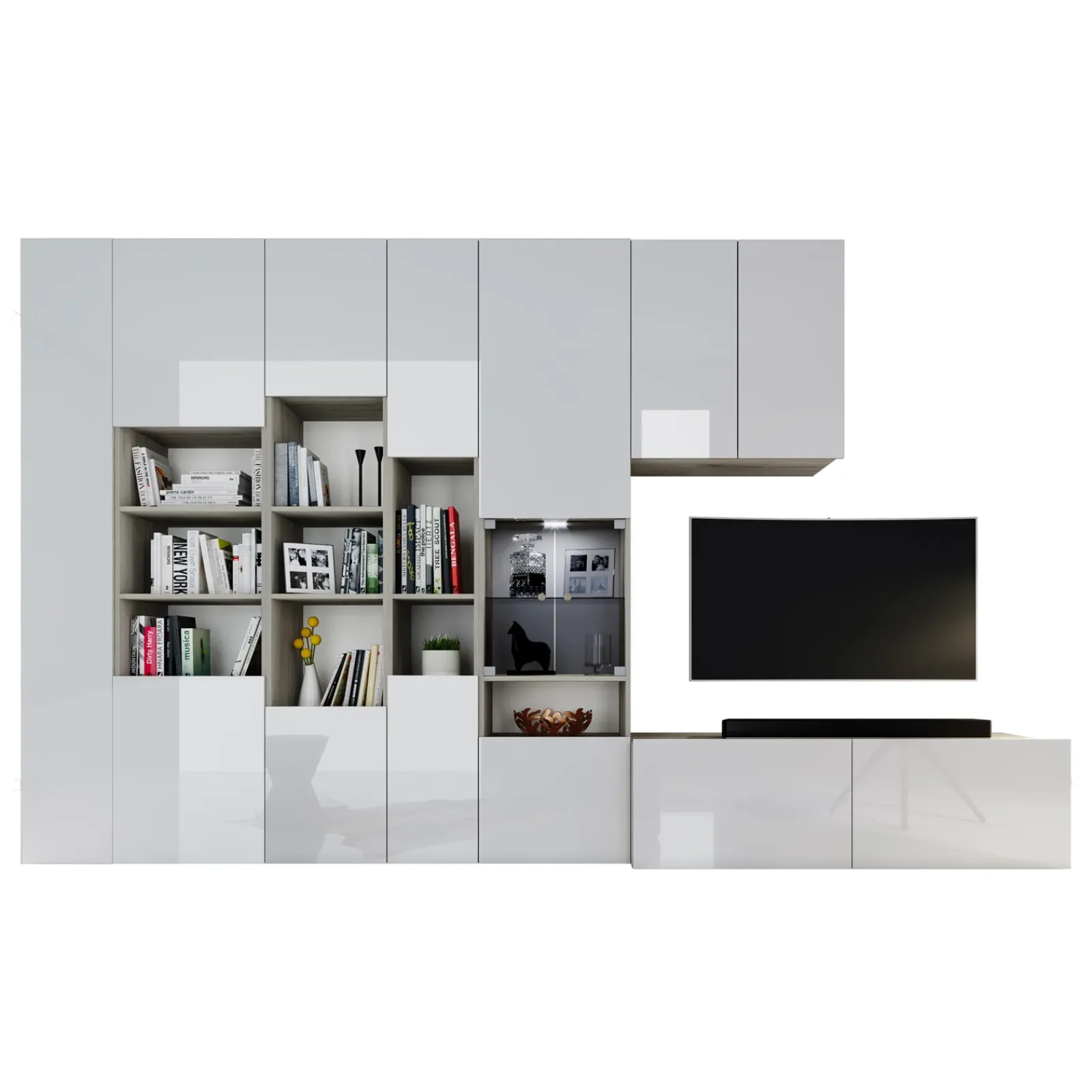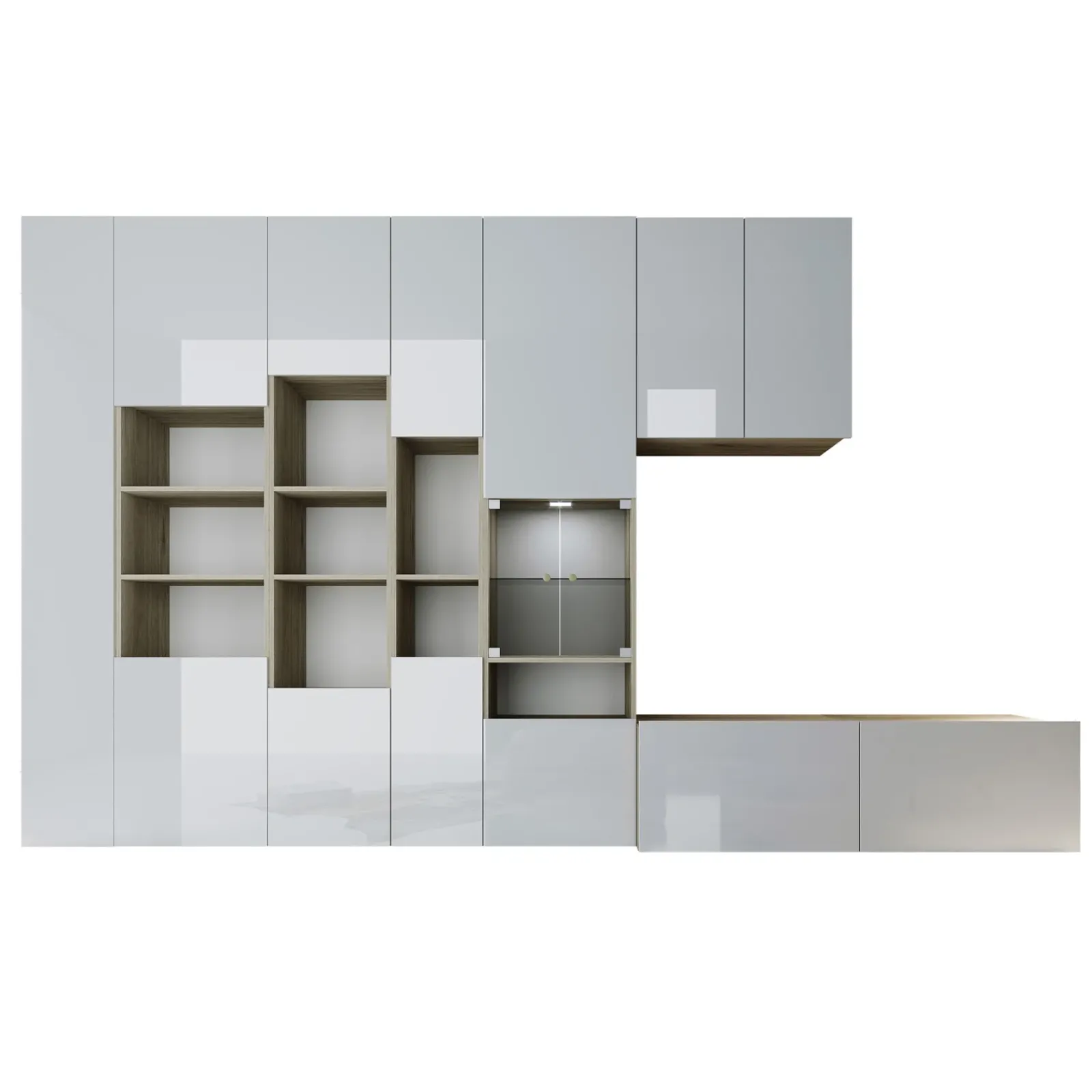 Garnero Arredamenti Parete Attrezzata A Terra|Pareti Attrezzate-Parete attrezzata 340x205h cm rovere bianco lucido con led Shanti