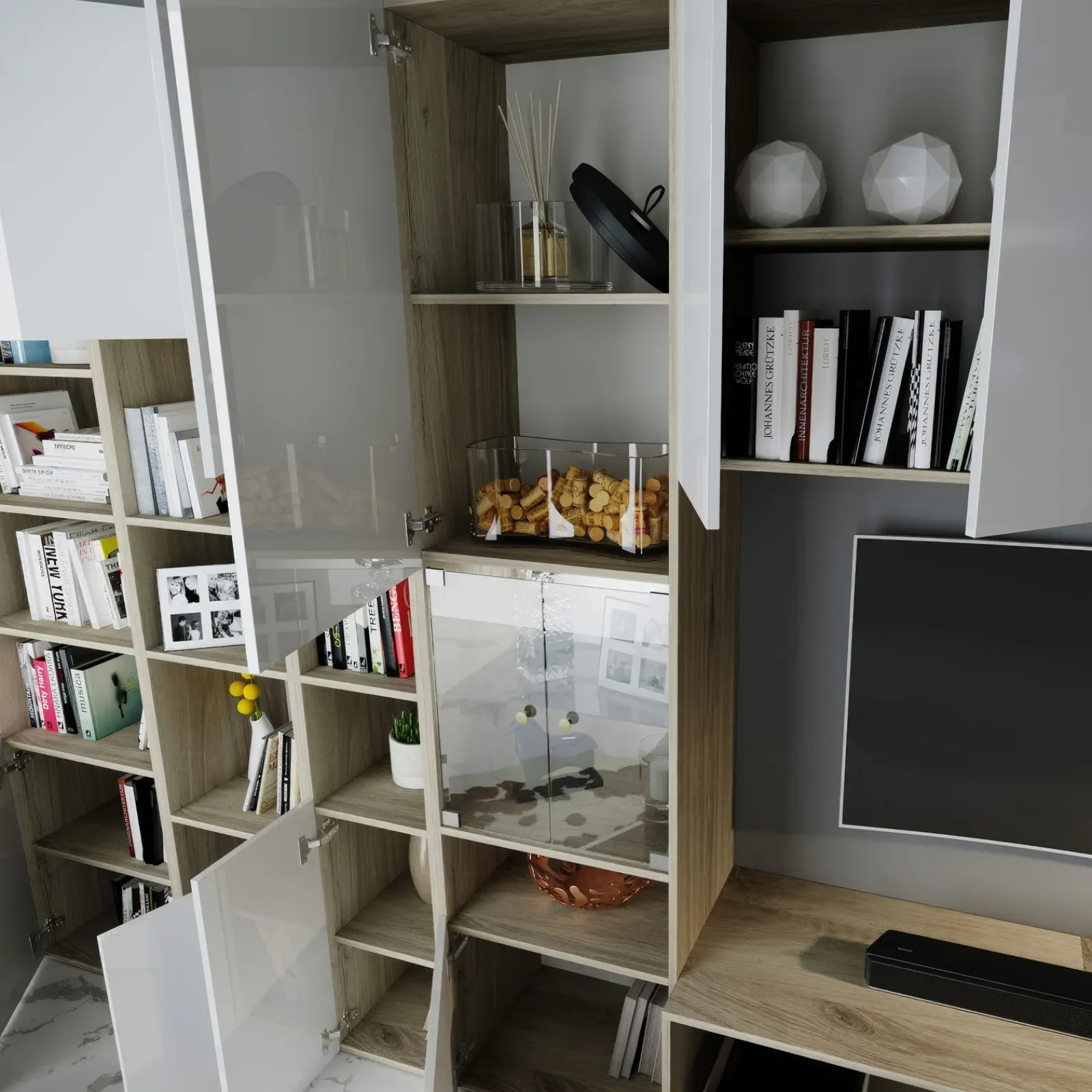 Shanti è composta da un mobile TV con 2 ante a ribalta e un pensile a due ante battenti, che può essere montato sopra il mobile TV. La vetrina con illuminazione led sarà perfetta per esporre i tuoi oggetti preferiti. I vani a giorno possono essere utilizzati per sistemare i libri o per mettere in bella mostra le tue fotografie e i ricordi. Nei vani nascosti dietro le antine potrai invece ritirare tutto quello che non vuoi mostrare. Infine, completa la composizione una comoda ed elegante libreria laterale a 6 vani. Con Shanti il tuo living sarà sempre in ordine!