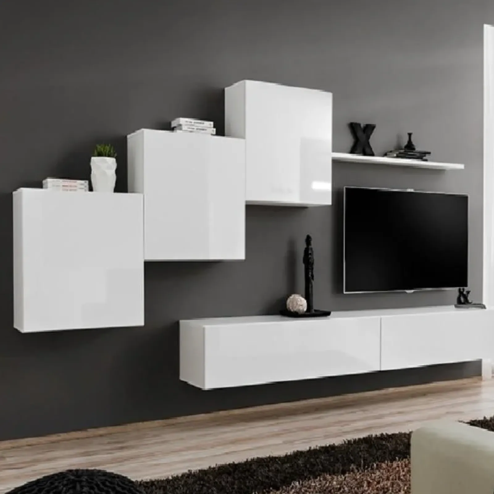 La parete attrezzata Geo 08 si compone di 2 porta tv con apertura a ribalta che nascondono 3 vani ciascuno; una mensola e 3 cubi con anta battente che nascondono un ripiano ciascuno.