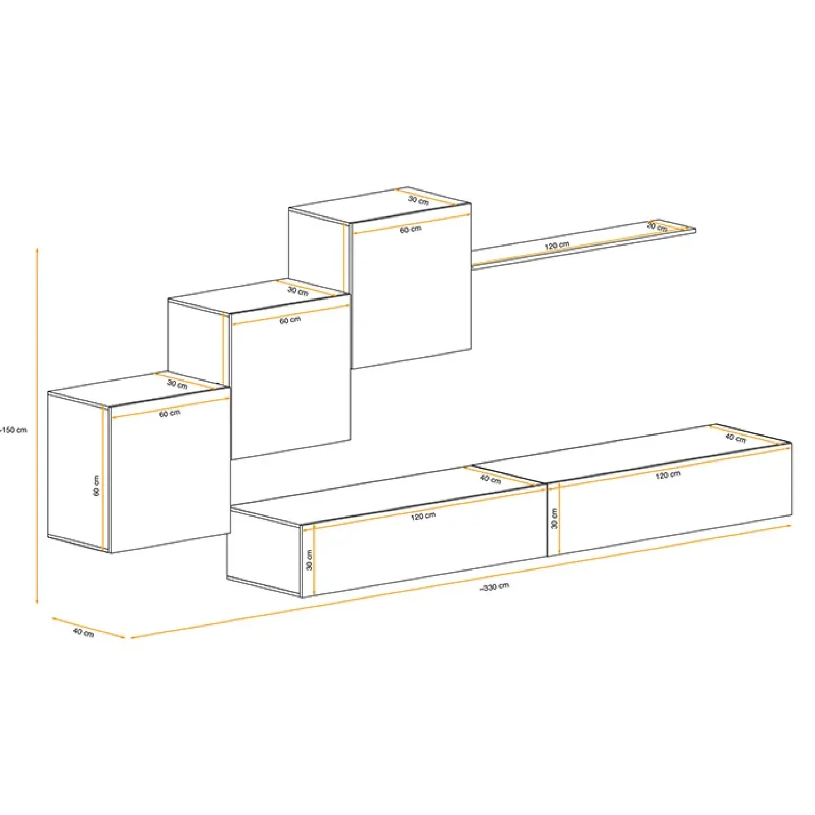- dimensioni totali: L.330 x P.40 x H.160 cm