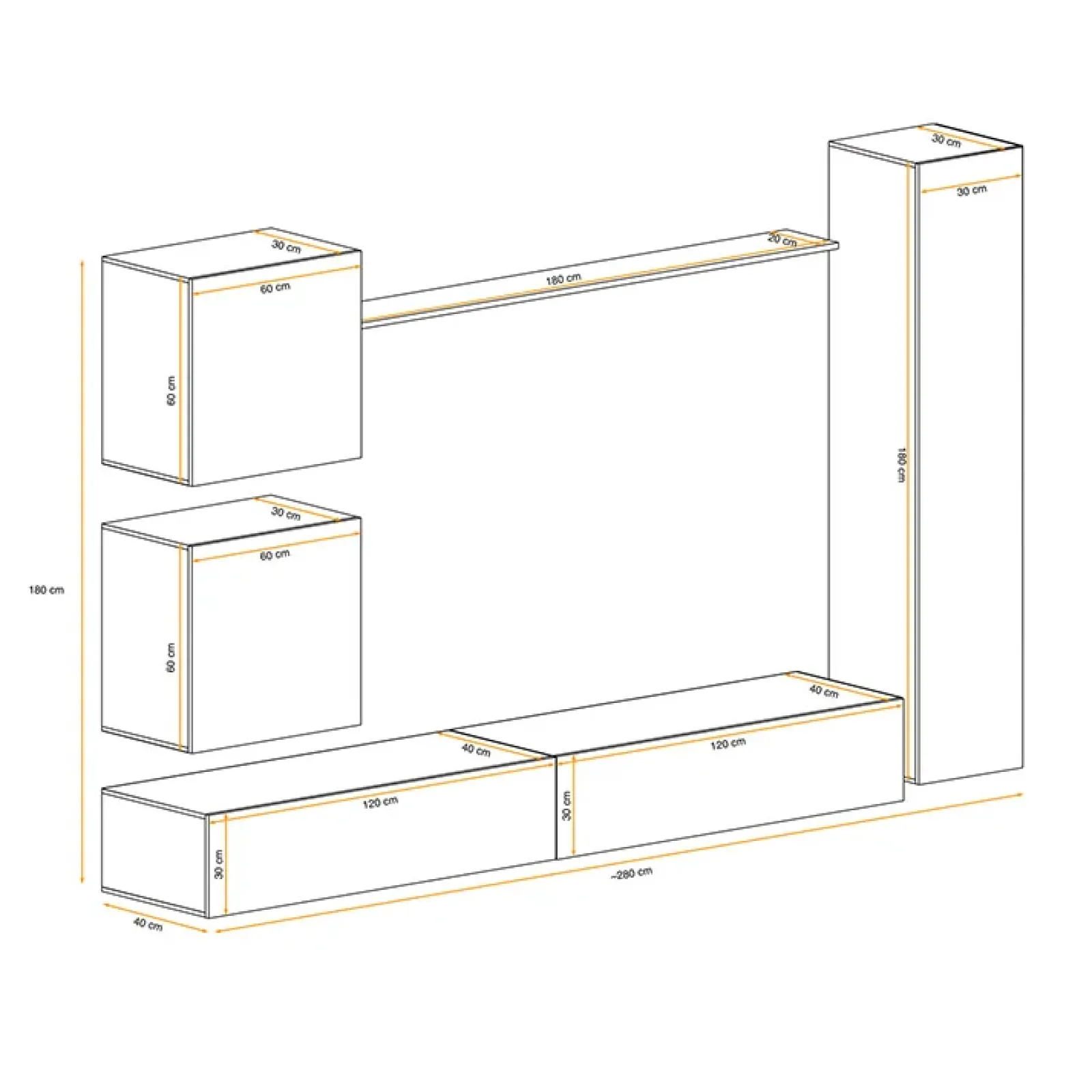 - dimensione pensile orizzontale (x2): L.120 x P.40 x H.30 cm