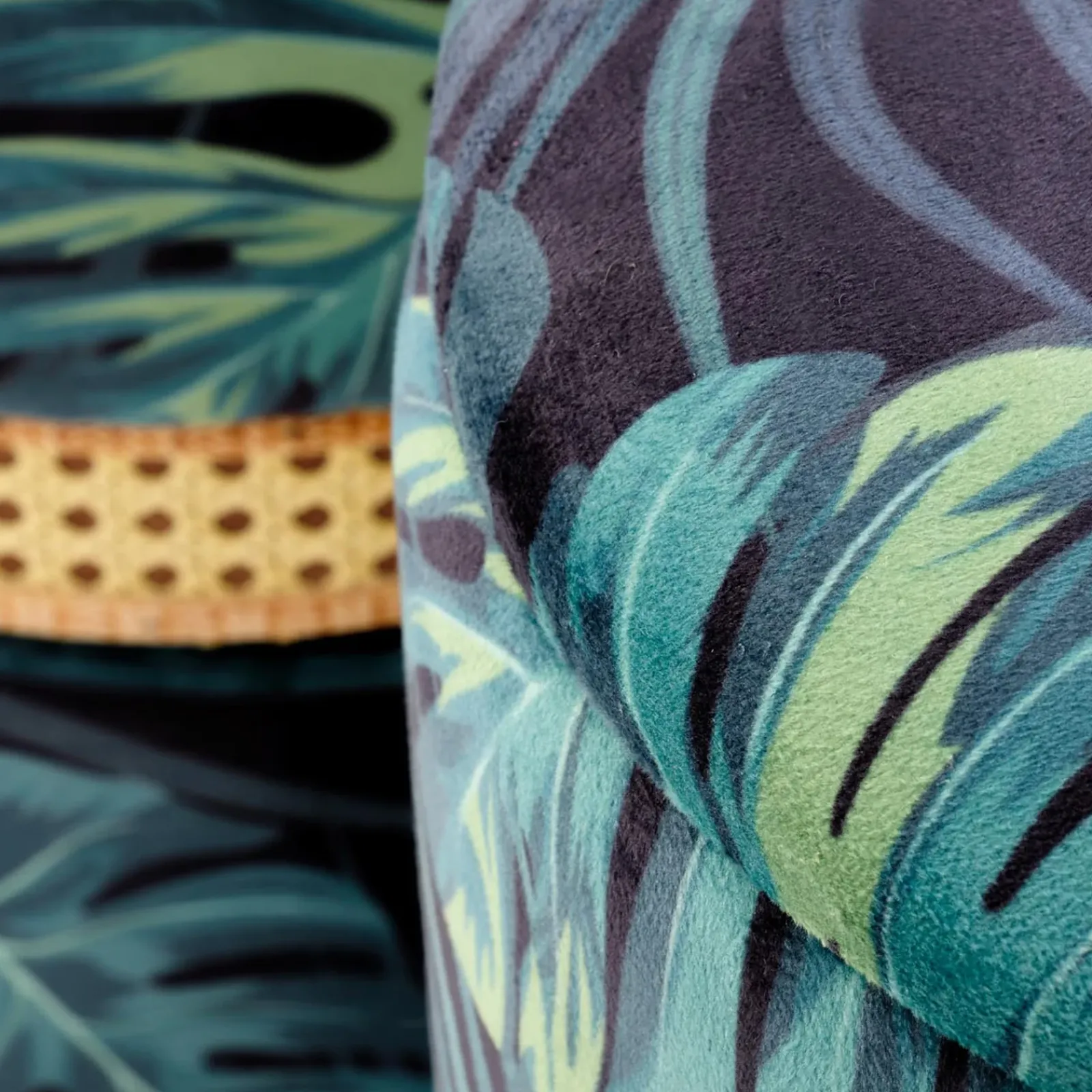 Il set 2 pouf Thalia unisce estetica esotica e praticità in un design originale e funzionale. Rivestiti con un’elegante fantasia tropicale a foglie verdi e blu su fondo scuro, questi pouf donano un tocco vivace e raffinato a qualsiasi ambiente.