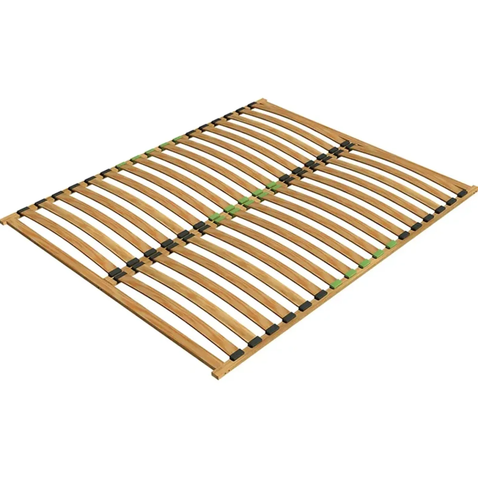 Il telaio è rinforzato da un traverso centrale, grazie al quale viene assicurata l’adeguata stabilizzazione. I portadoghe sono realizzati in modo da garantire un uso silenzioso e il montaggio stabile delle doghe al telaio.