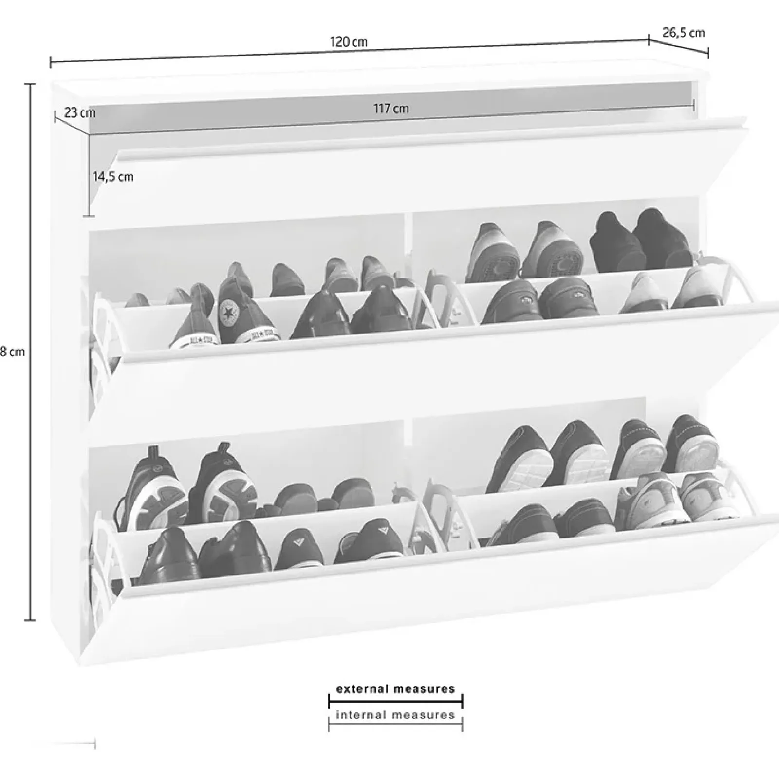 Dotata di due ante principali con apertura a ribalta, la scarpiera Eclisse può ospitare fino a 24 paia di scarpe, distribuite in due vassoi portascarpe a due scomparti. Oltre allo spazio dedicato alle scarpe, dispone di un vano superiore con antina a ribalta, ideale per riporre altri oggetti di uso quotidiano in modo organizzato.