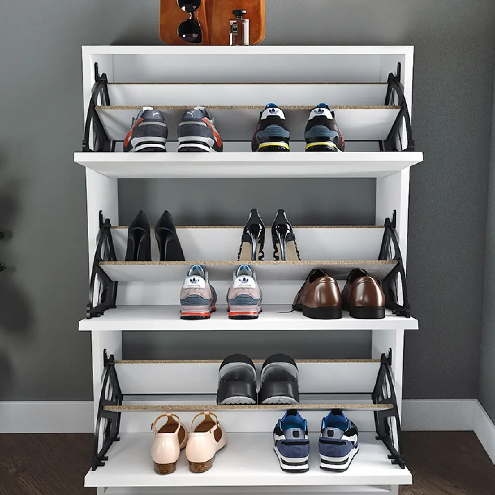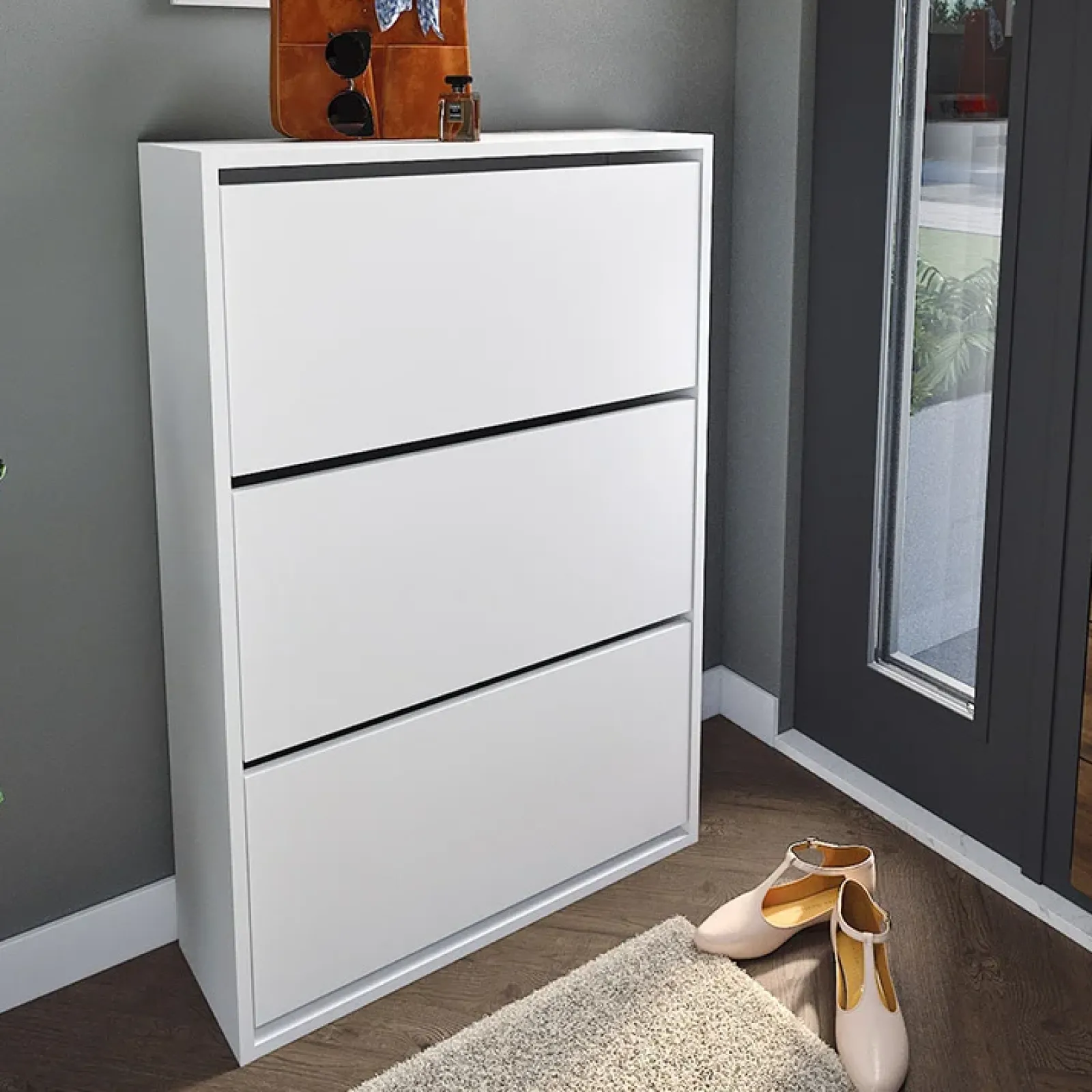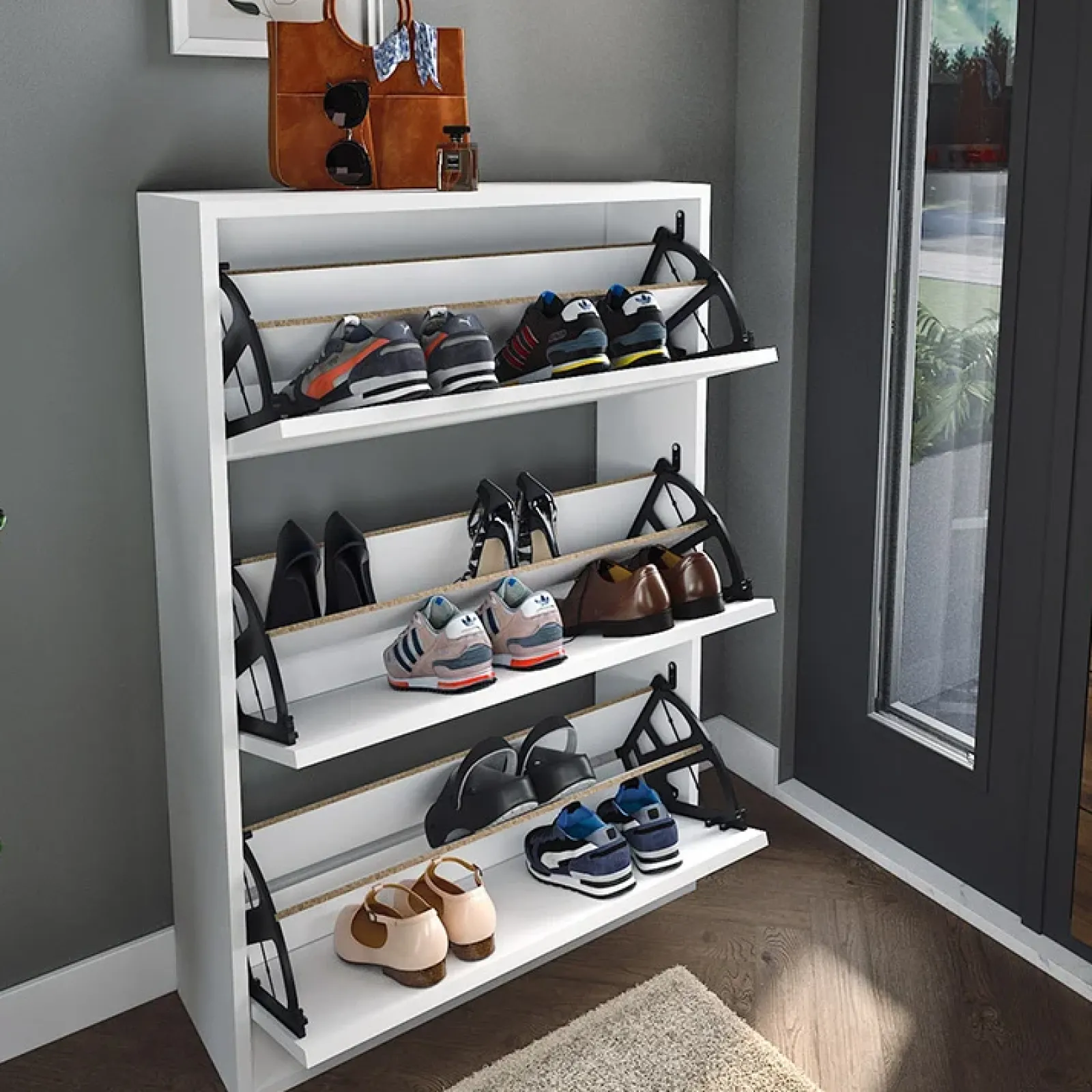 Posizionare la scarpiera in casa all’ingresso è un’ottima scelta se si vogliono indossare le scarpe all’ultimo momento! Con la Scarpiera moderna Palmaria è possibile riporre ben 18 paia di scarpe all’interno dei ripiani contenuti nelle 3 ante a ribalta. Le dimensioni della scarpiera forniscono al contempo facilità d’uso, ma soprattutto adattabilità a qualsiasi stanza della casa. Ingresso, corridoio, bagno, camera da letto, potrai riporla dove hai più spazio e in base alle esigenze.