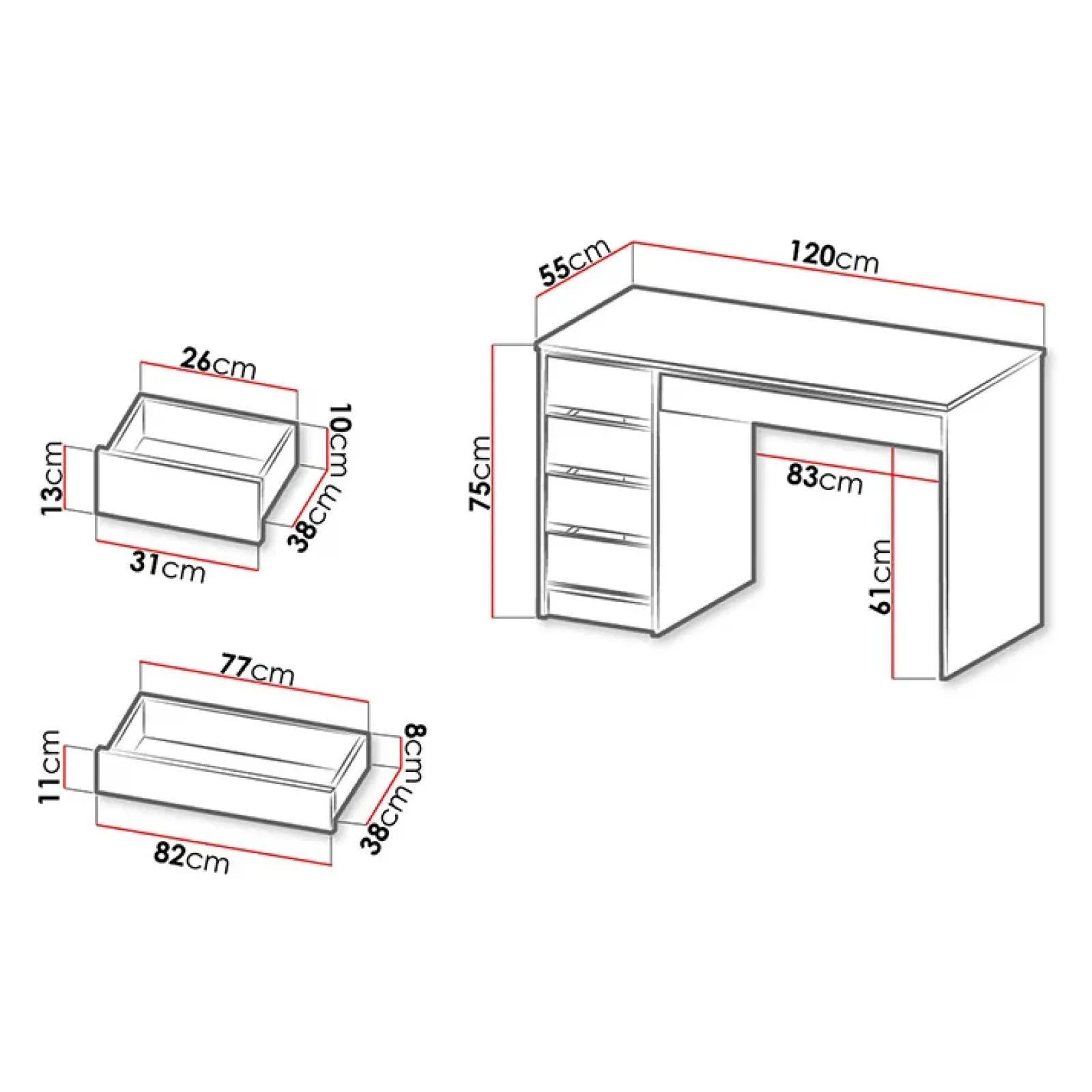 - scrivania reversibile: i cassetti possono essere montati sul lato sinistro o destro