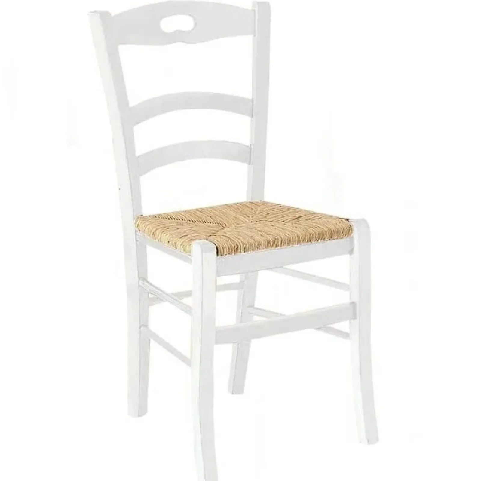 Sedia con telaio in legno massello laccato bianco e fondo in paglia rustica.