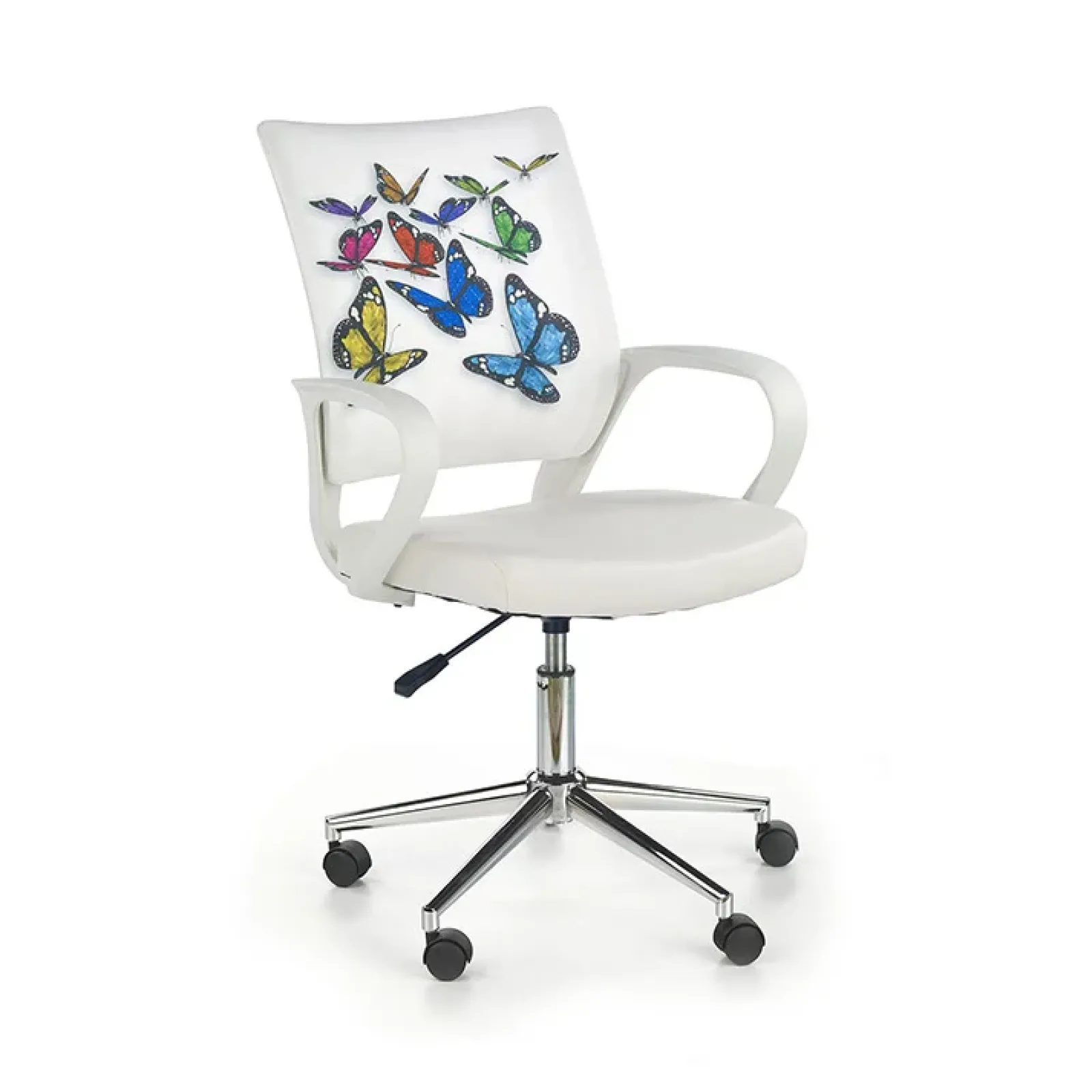 Sedia per scrivania ragazzi in ecopelle bianca con grafica Farfalle, unisce comodità e stile per la camera dei tuoi ragazzi.